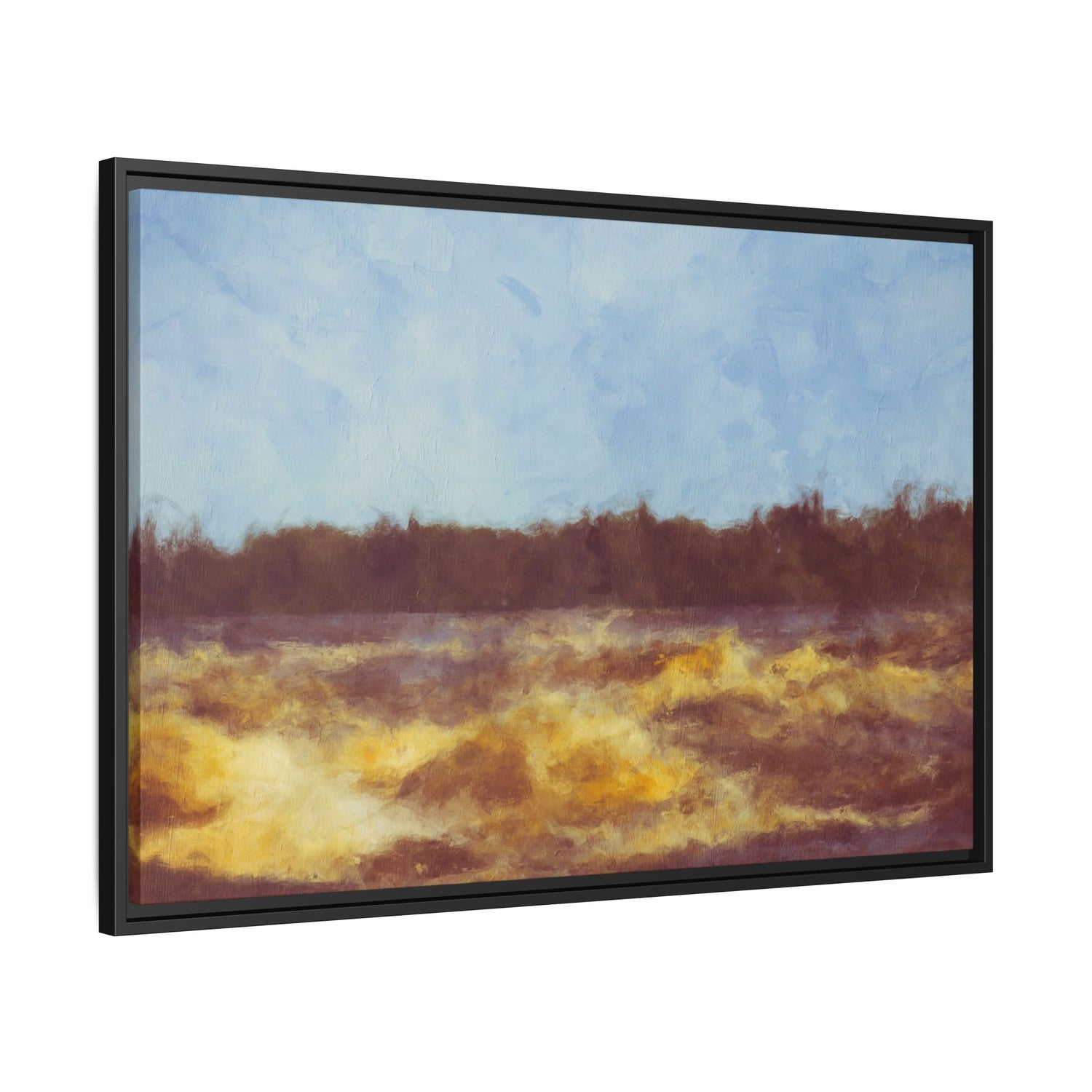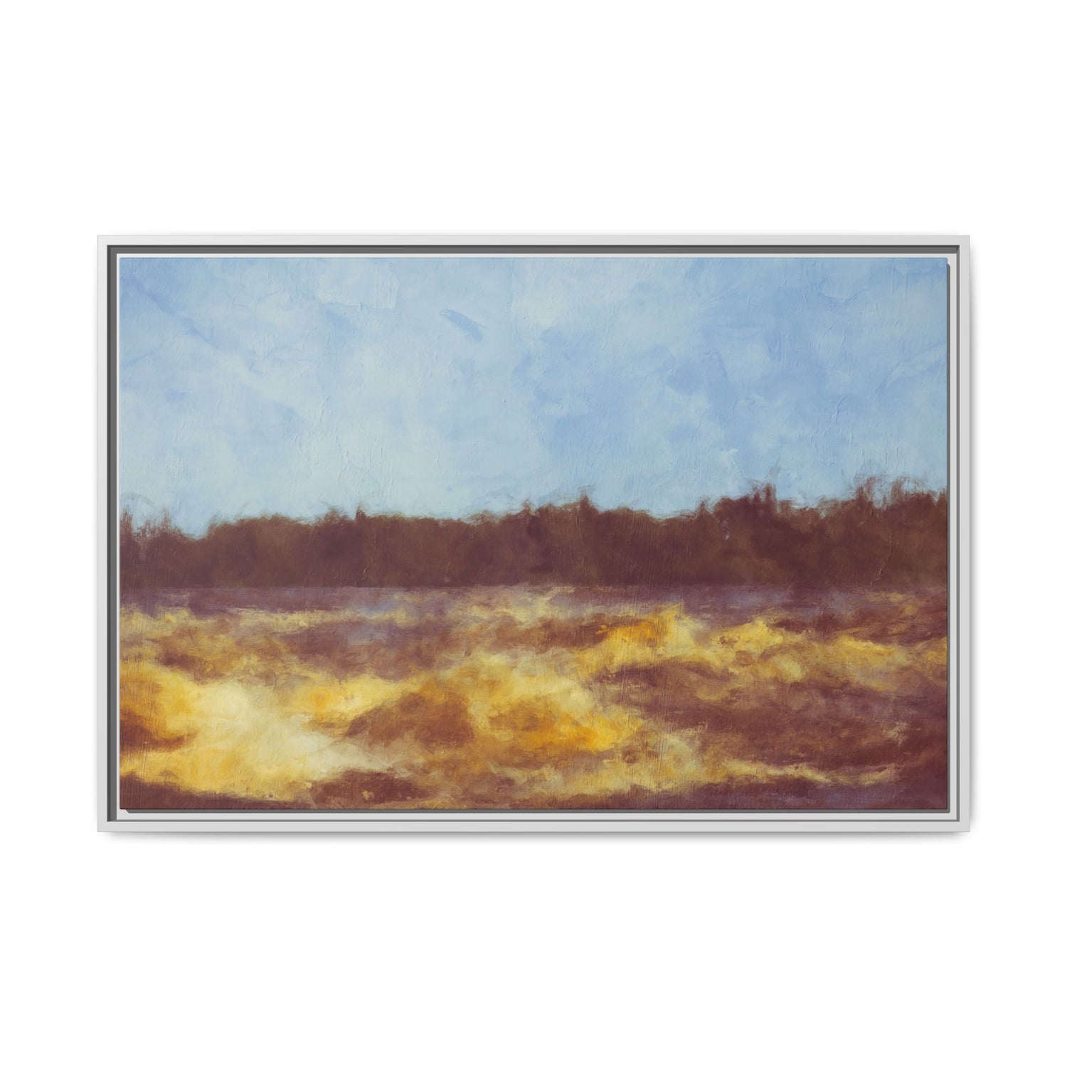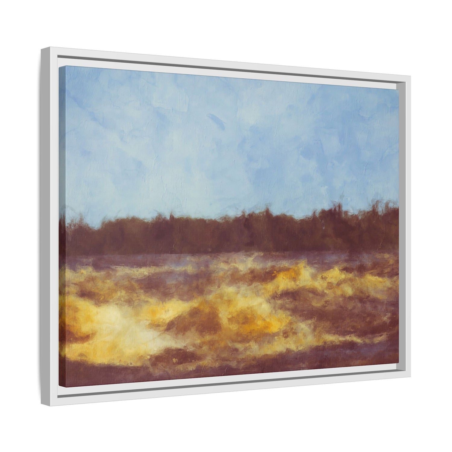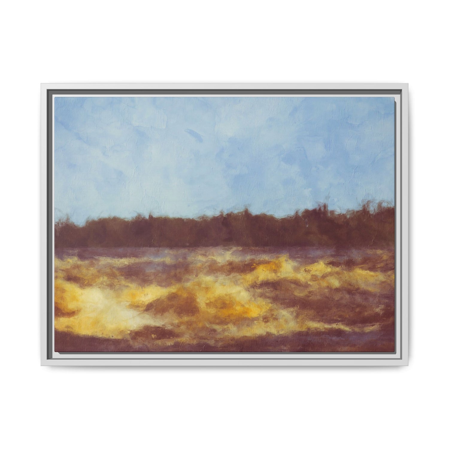 This fine art piece captures the Pelican Rapids of the Slave River near Fort Smith, Northwest Territories, where turbulent waters meet tranquil skies. The expressive brushwork conveys the raw power and movement of nature, blending golden earth tones with cool blues for a vivid portrayal of Northern energy. A commanding artwork that evokes adventure and awe within any living space.