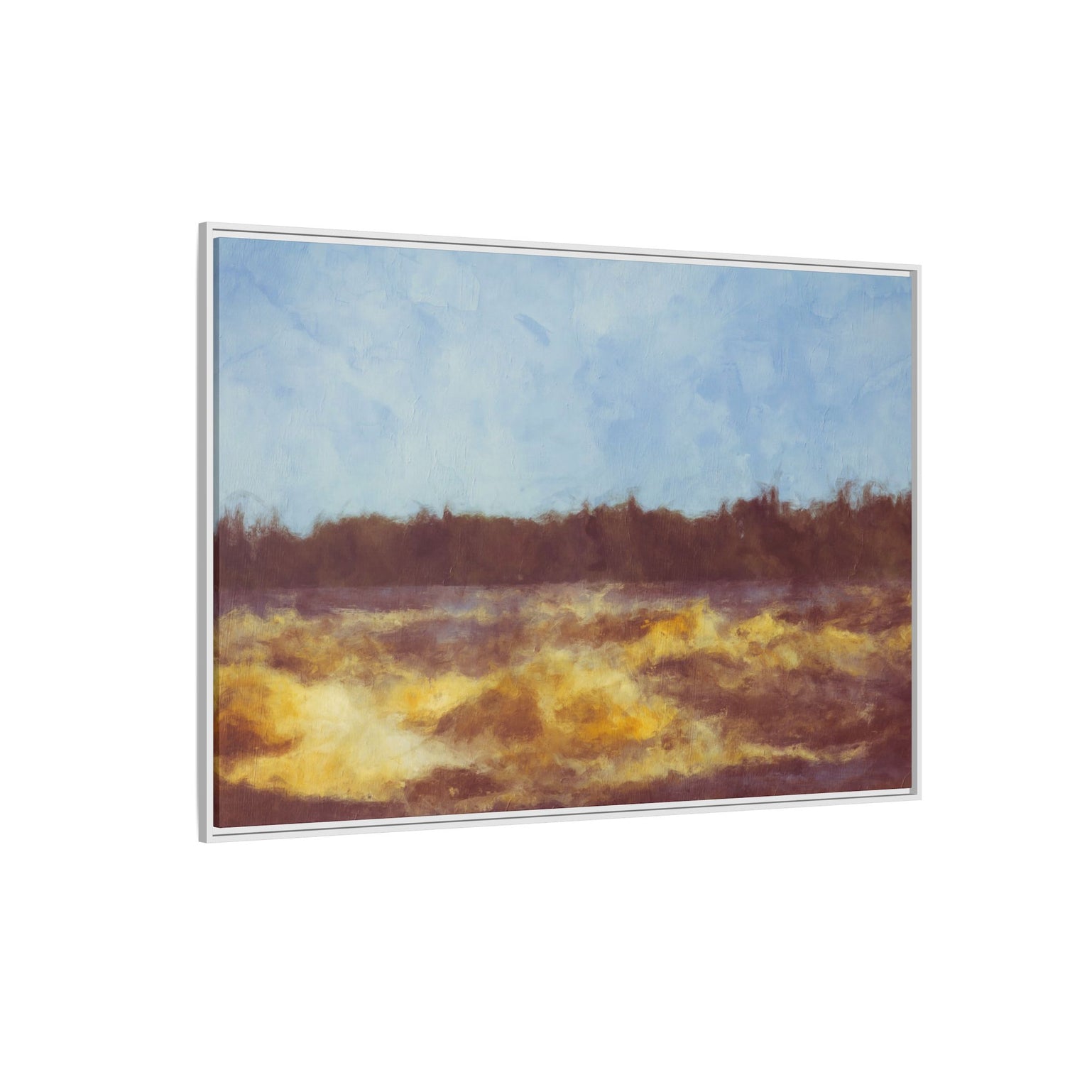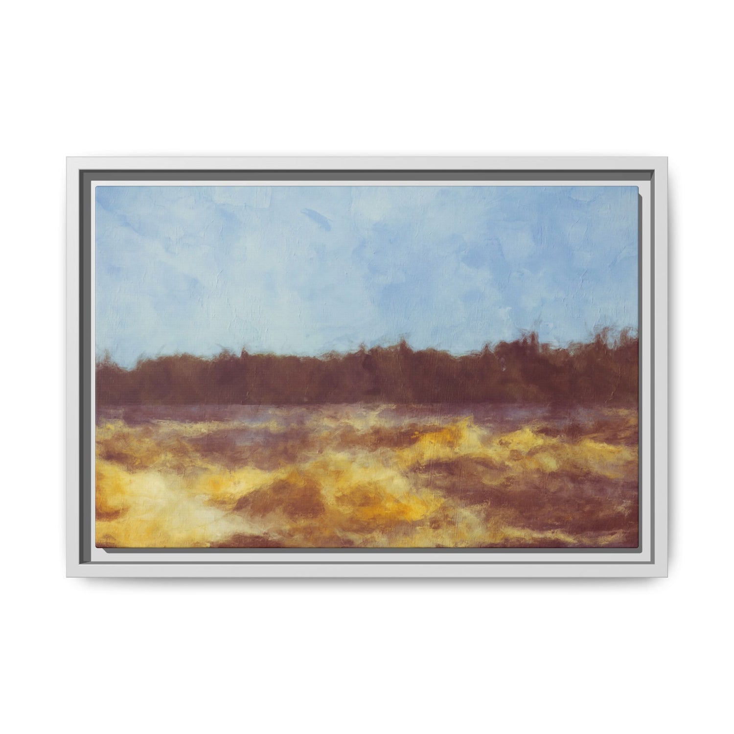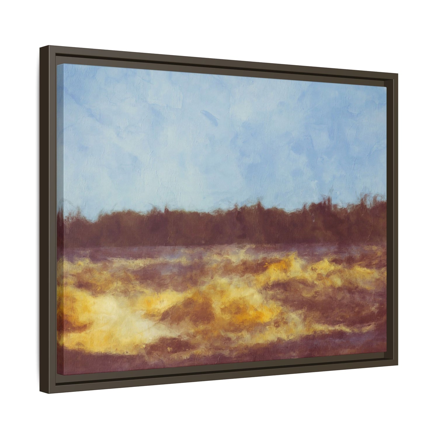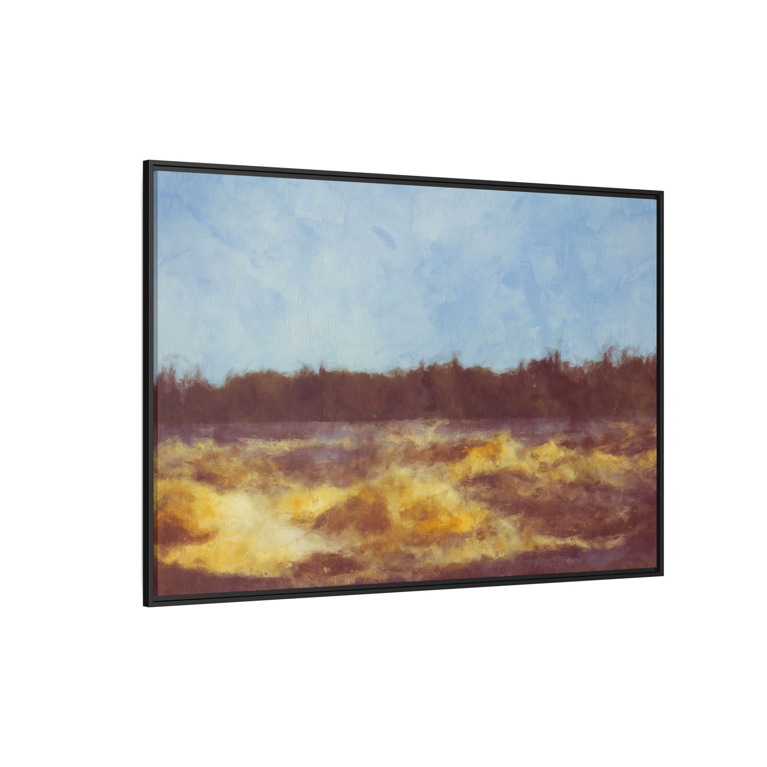 This fine art piece captures the Pelican Rapids of the Slave River near Fort Smith, Northwest Territories, where turbulent waters meet tranquil skies. The expressive brushwork conveys the raw power and movement of nature, blending golden earth tones with cool blues for a vivid portrayal of Northern energy. A commanding artwork that evokes adventure and awe within any living space.
