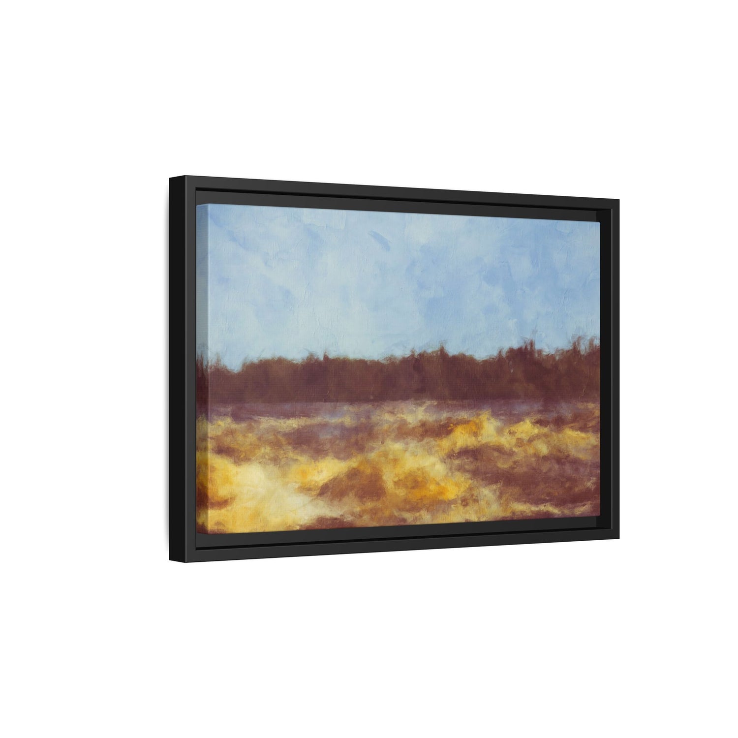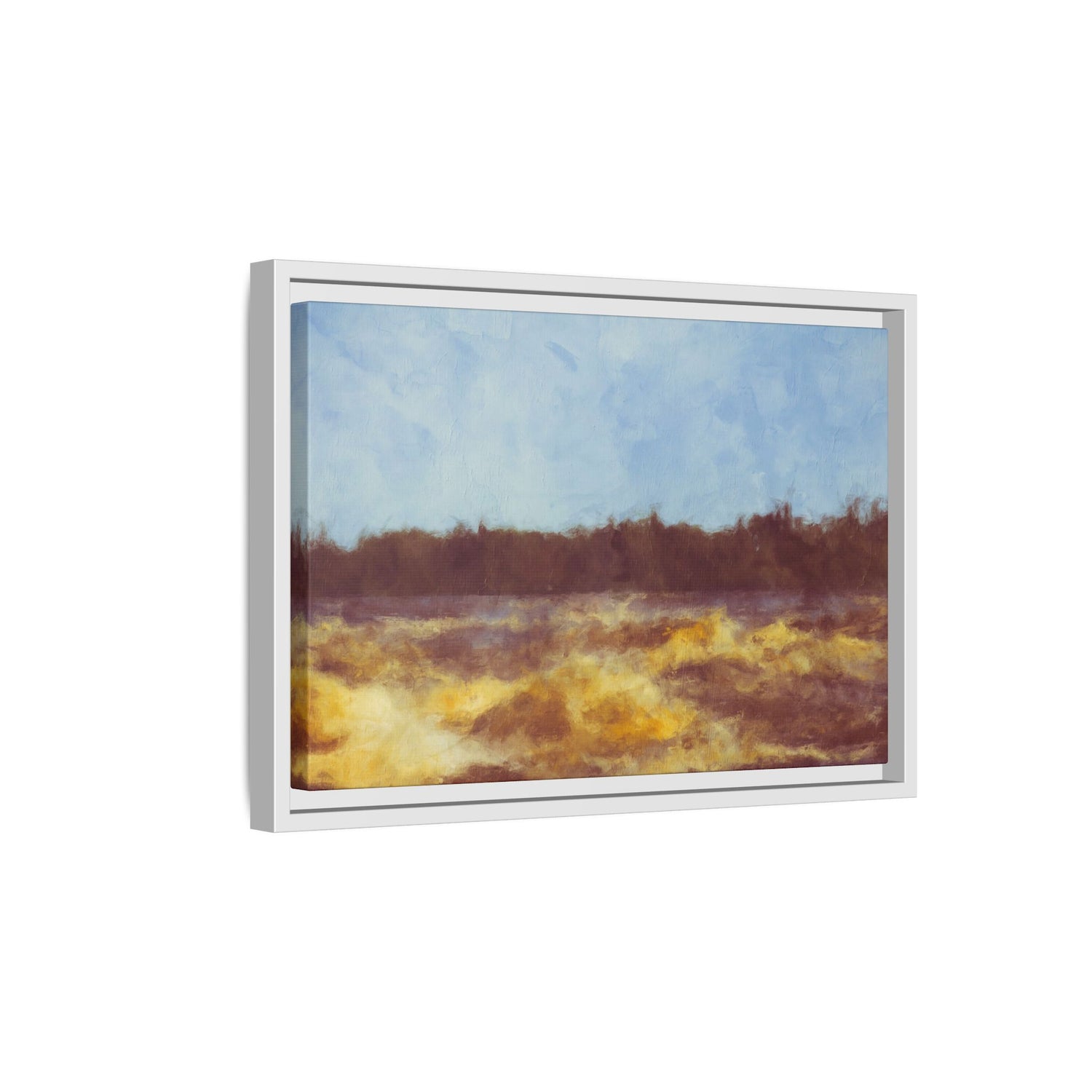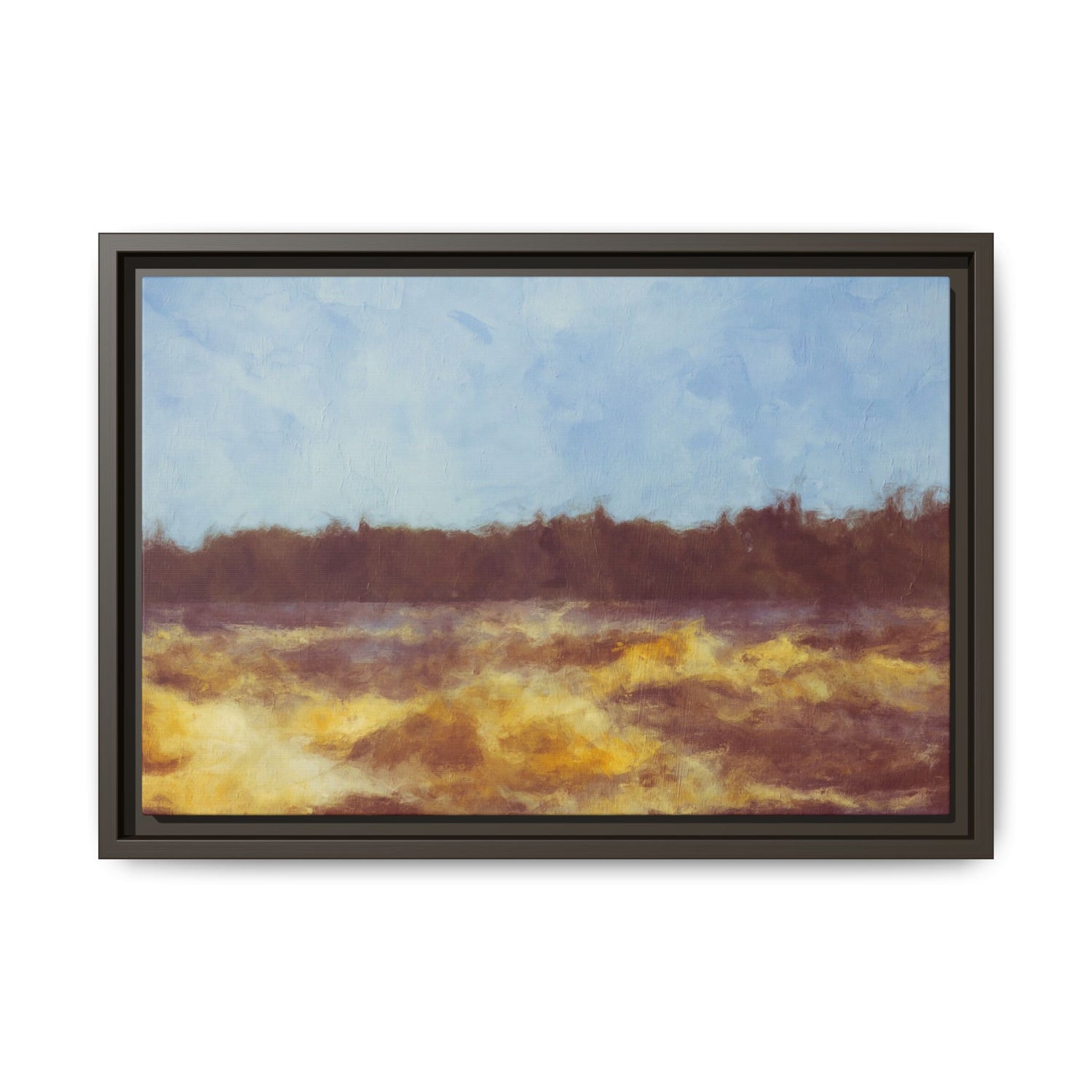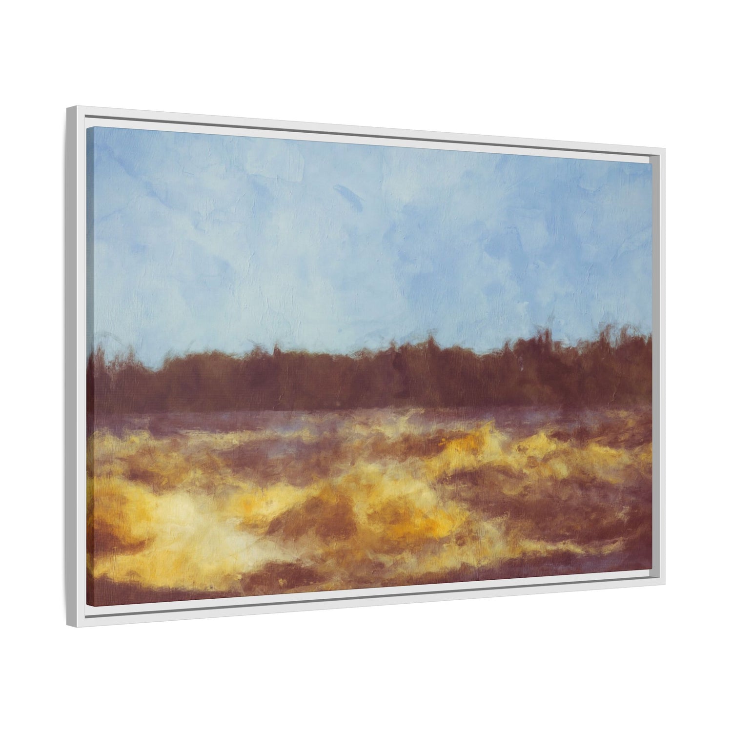This fine art piece captures the Pelican Rapids of the Slave River near Fort Smith, Northwest Territories, where turbulent waters meet tranquil skies. The expressive brushwork conveys the raw power and movement of nature, blending golden earth tones with cool blues for a vivid portrayal of Northern energy. A commanding artwork that evokes adventure and awe within any living space.