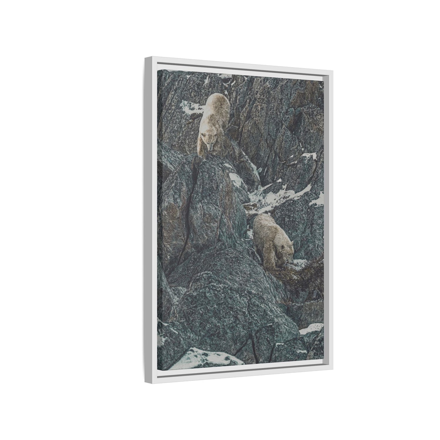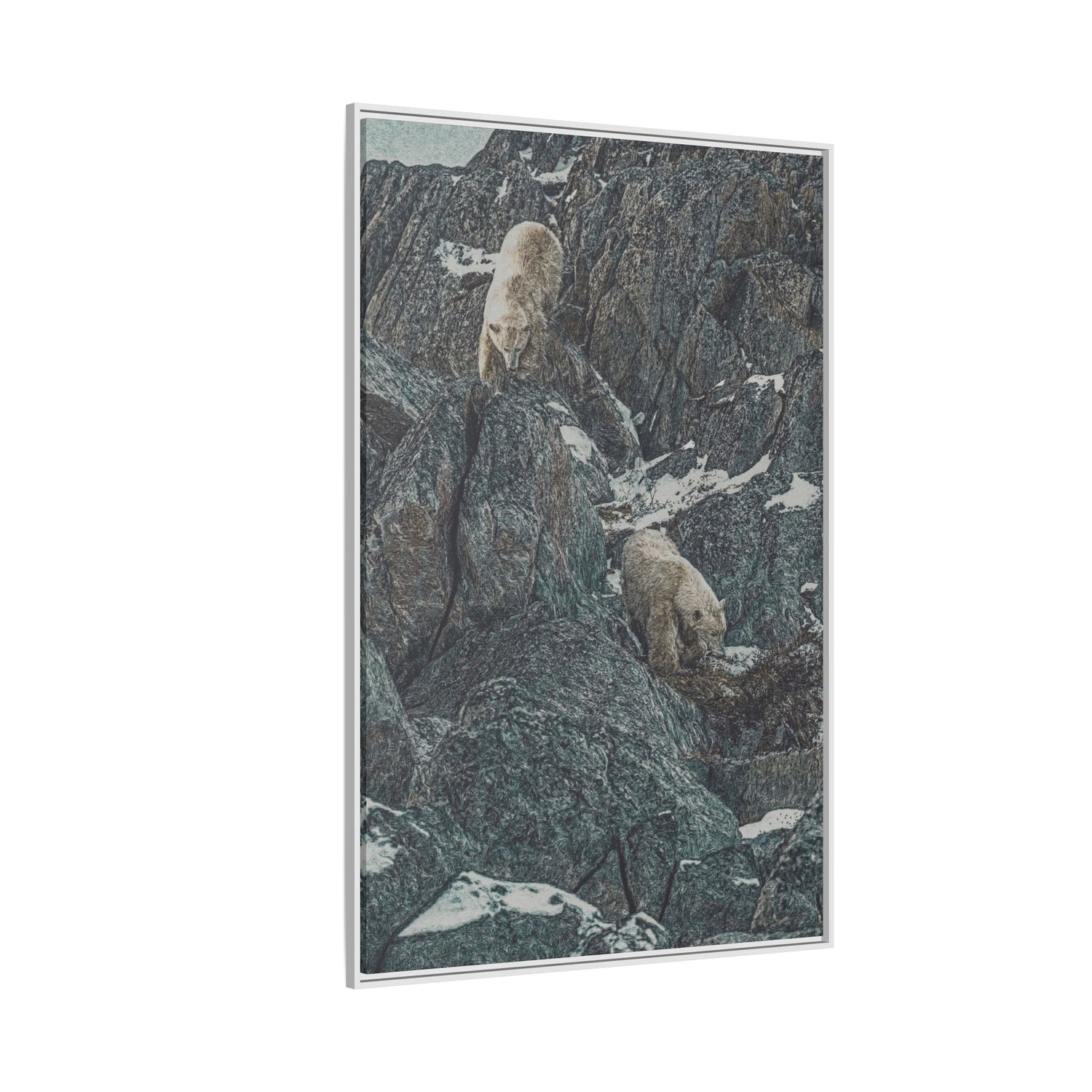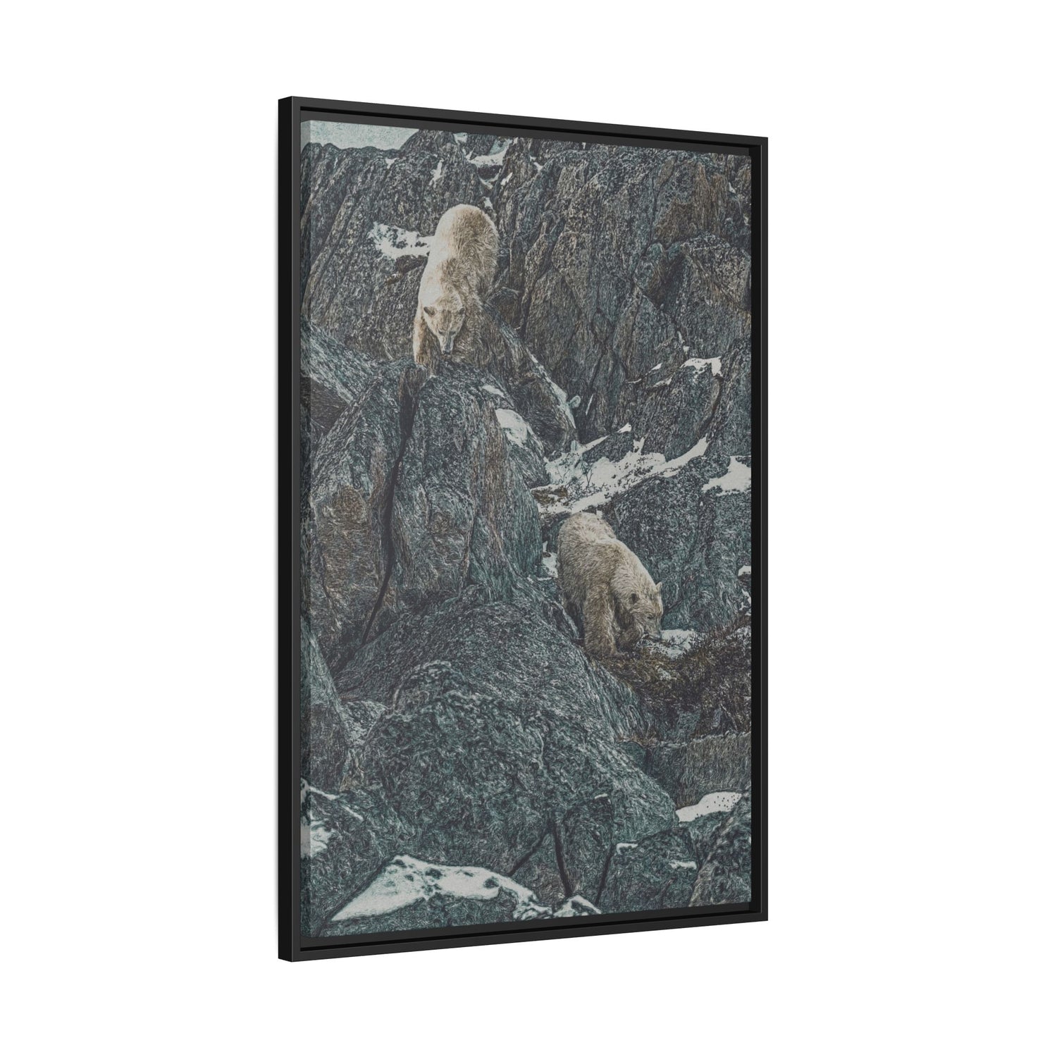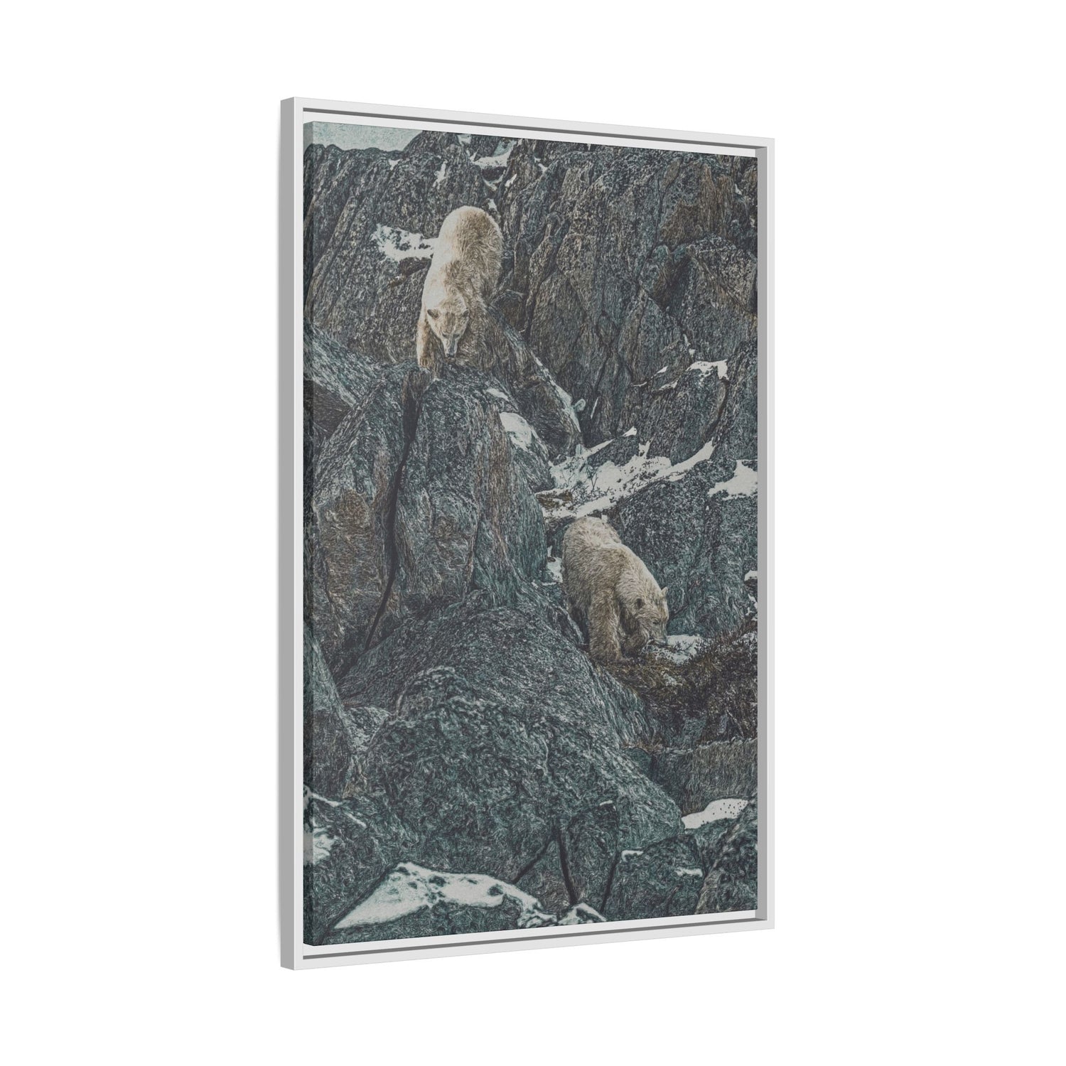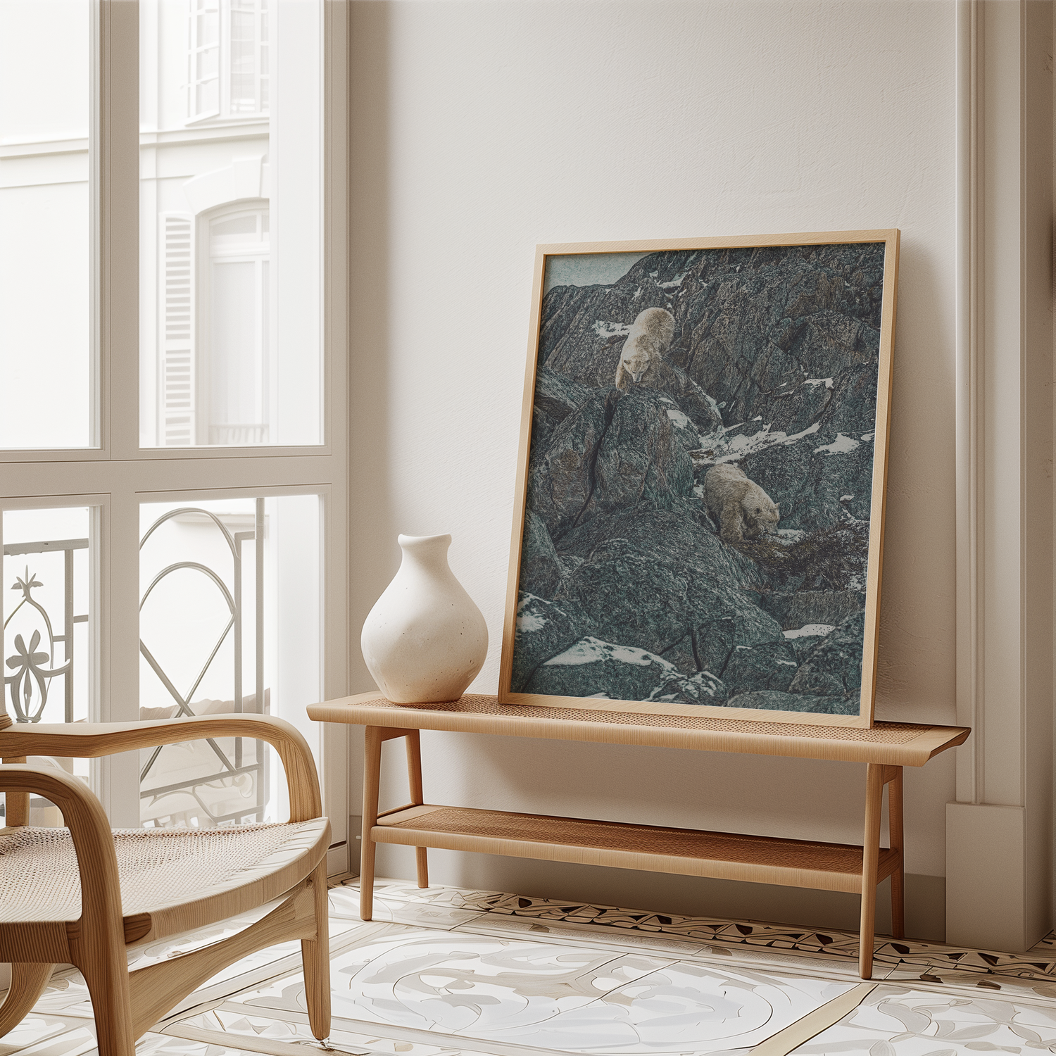 This fine art print portrays two polar bears traversing the rugged, icy cliffs of Hudson Bay near Churchill, Manitoba. The composition emphasizes texture, resilience, and natural strength, capturing a rare glimpse of life in the Arctic wilderness. With cool tones and textural layering, it evokes both tranquility and power, a striking centerpiece that celebrates the wild spirit of Canada’s northern frontier.