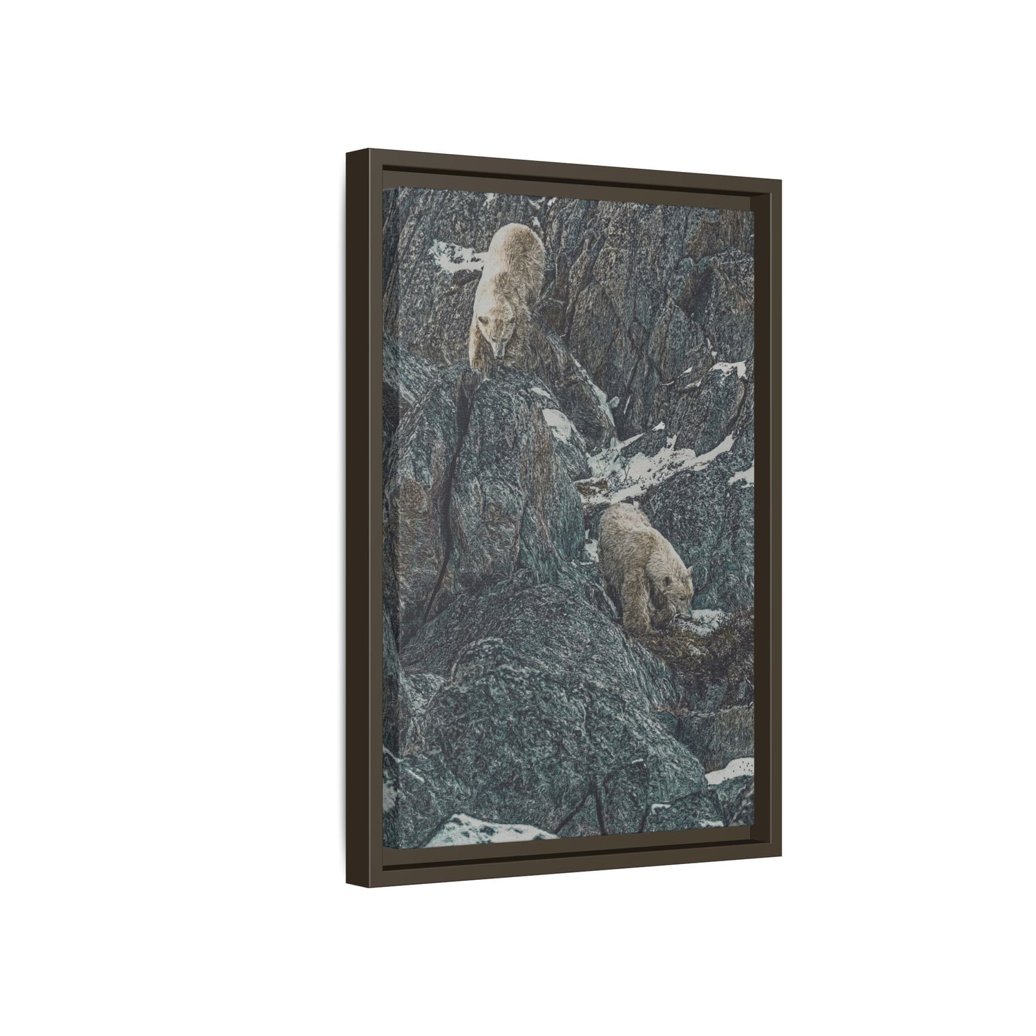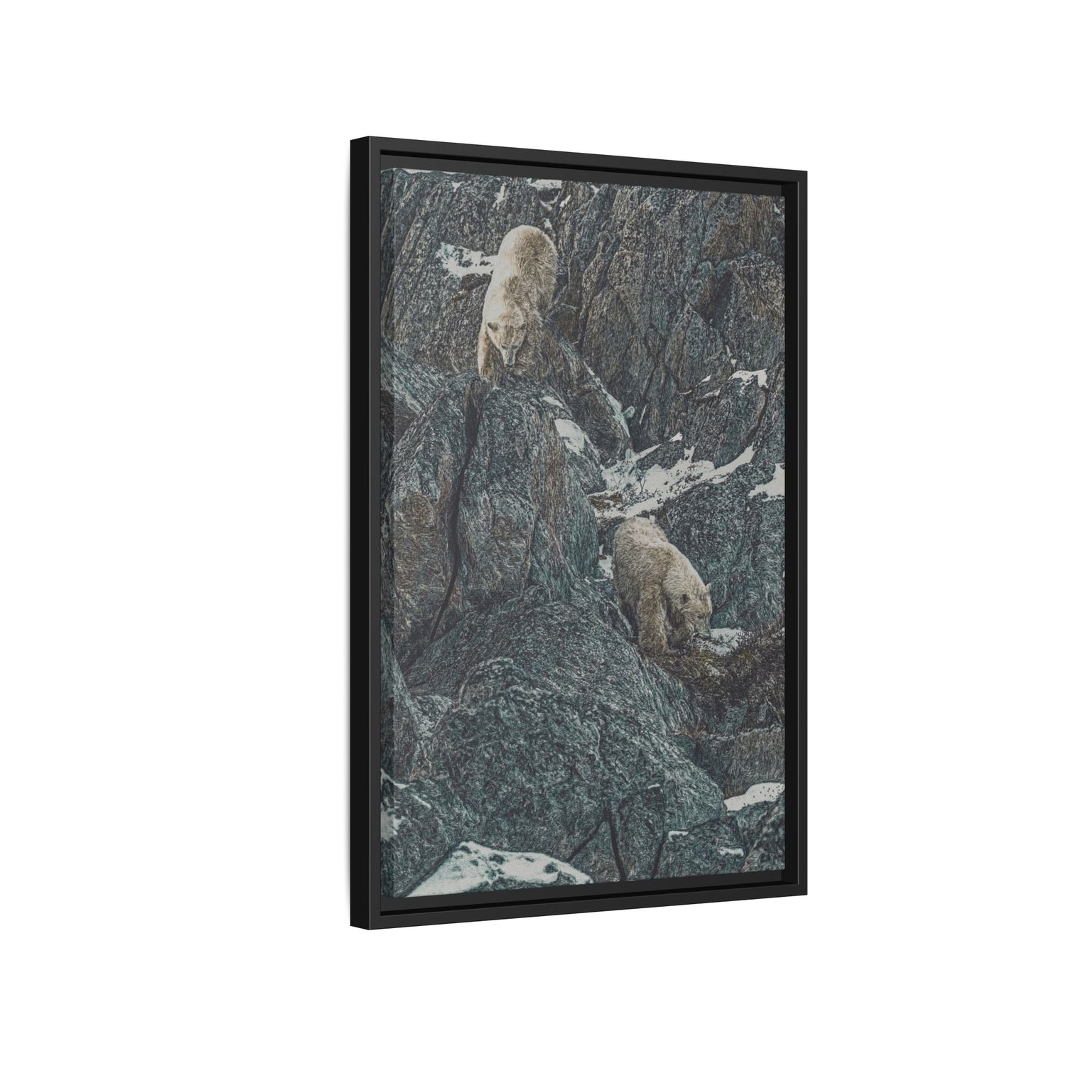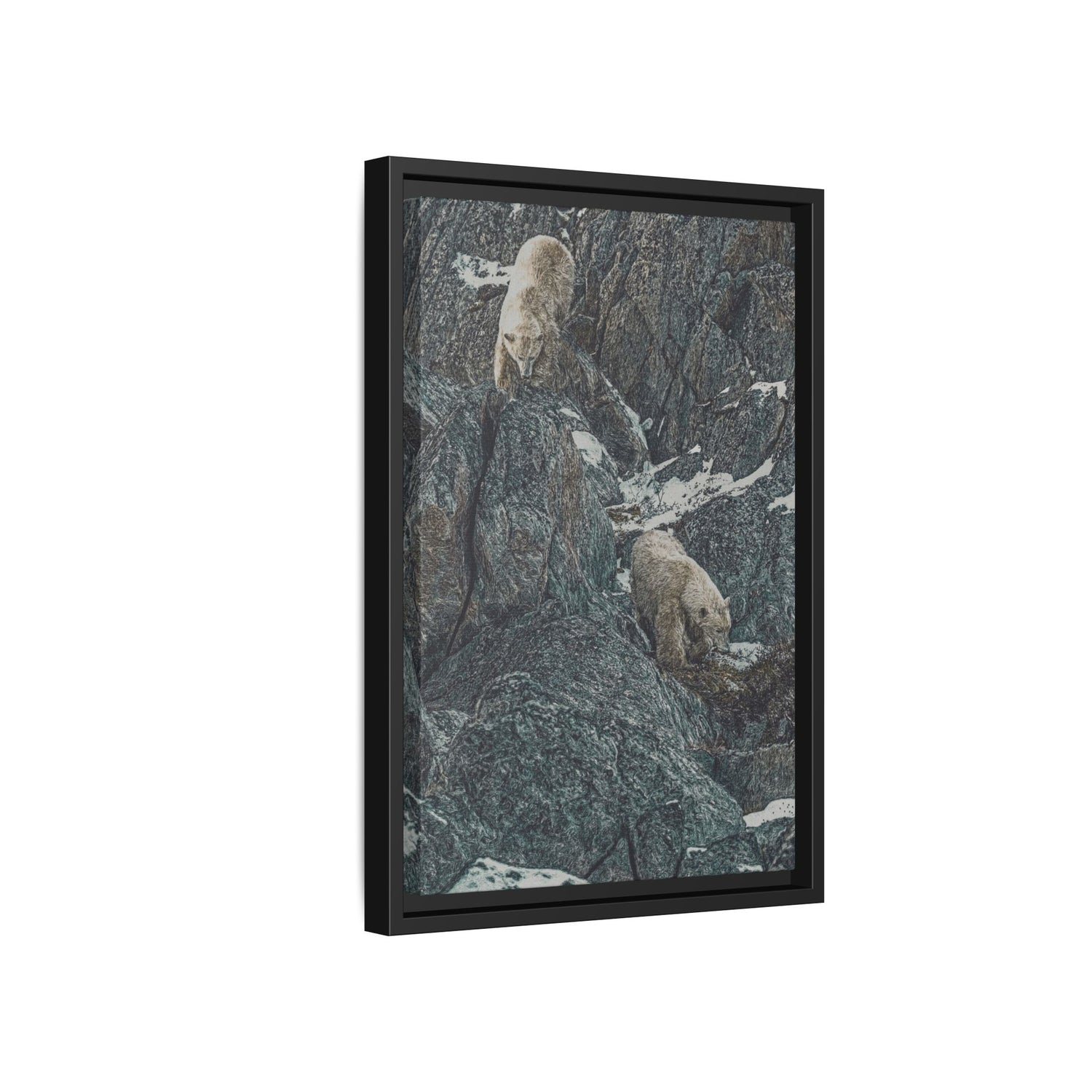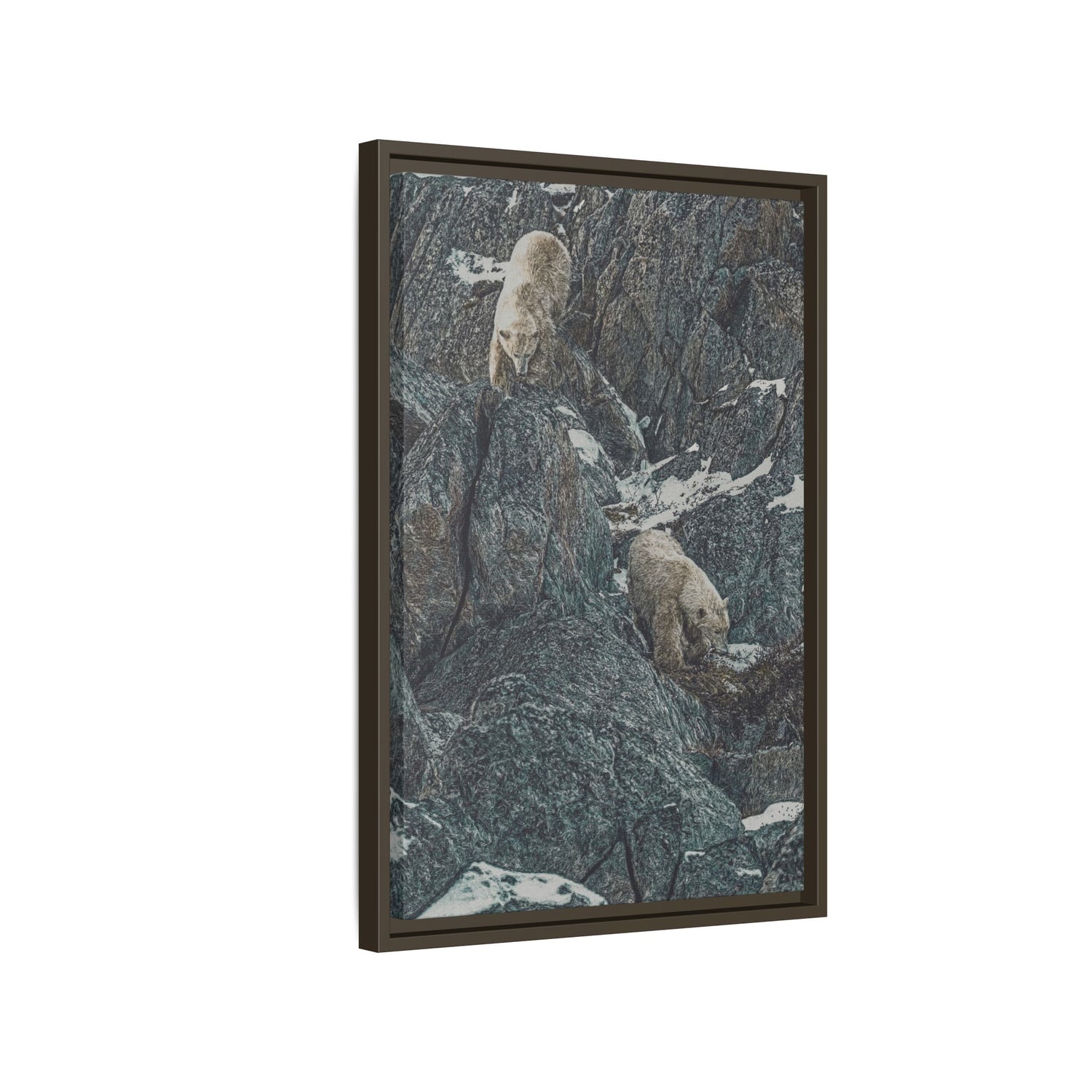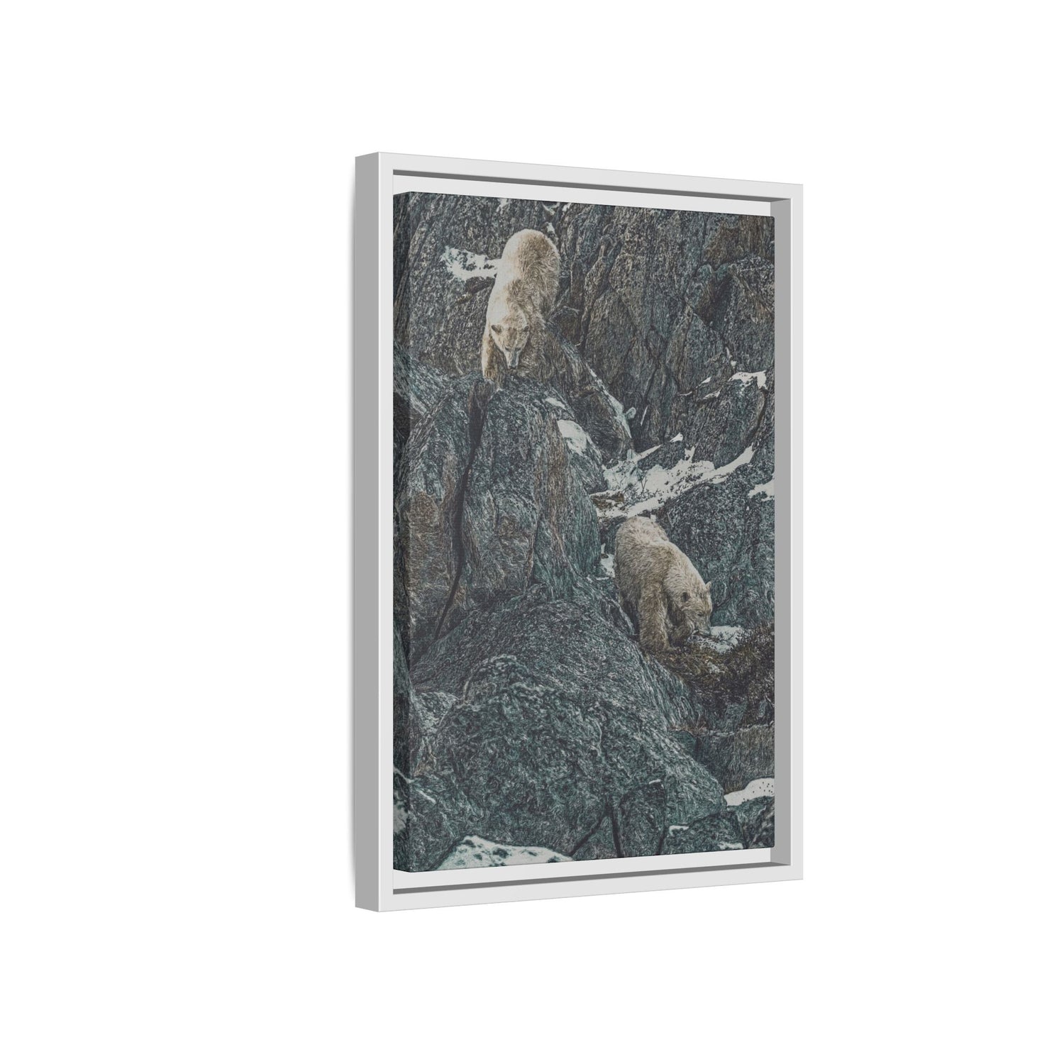 This fine art print portrays two polar bears traversing the rugged, icy cliffs of Hudson Bay near Churchill, Manitoba. The composition emphasizes texture, resilience, and natural strength, capturing a rare glimpse of life in the Arctic wilderness. With cool tones and textural layering, it evokes both tranquility and power, a striking centerpiece that celebrates the wild spirit of Canada’s northern frontier.