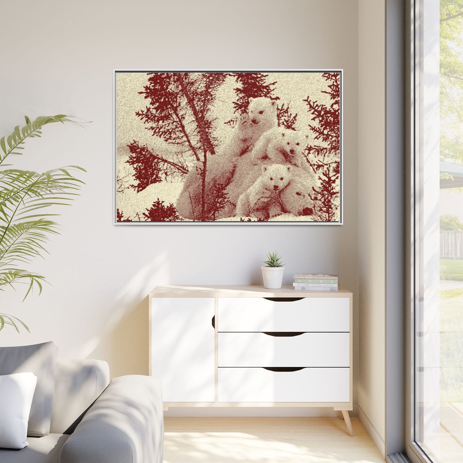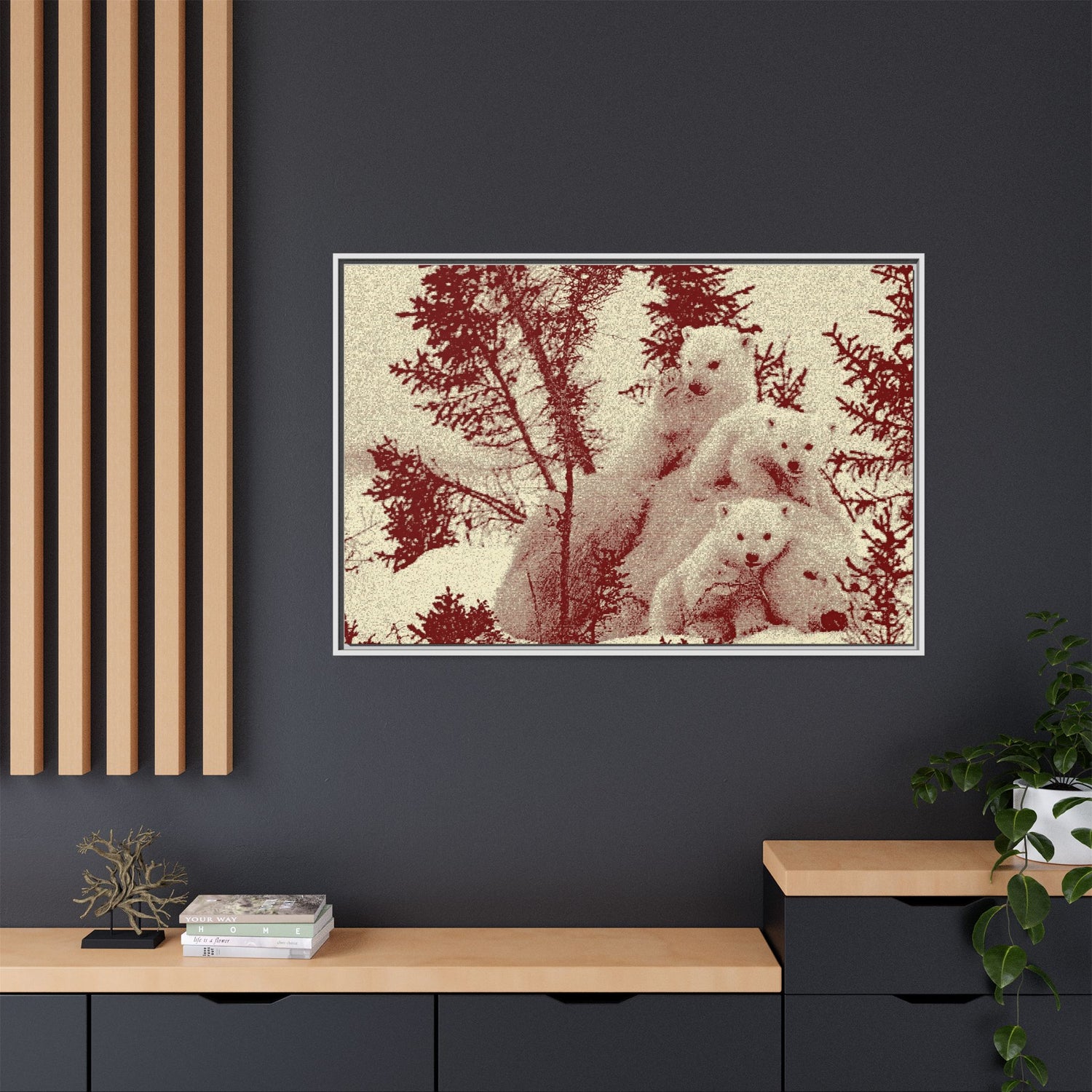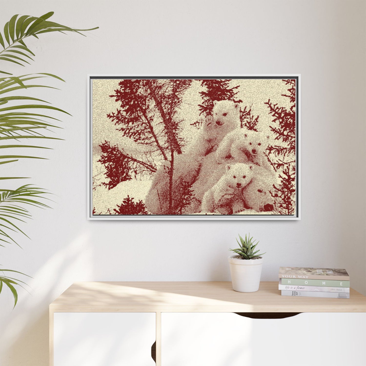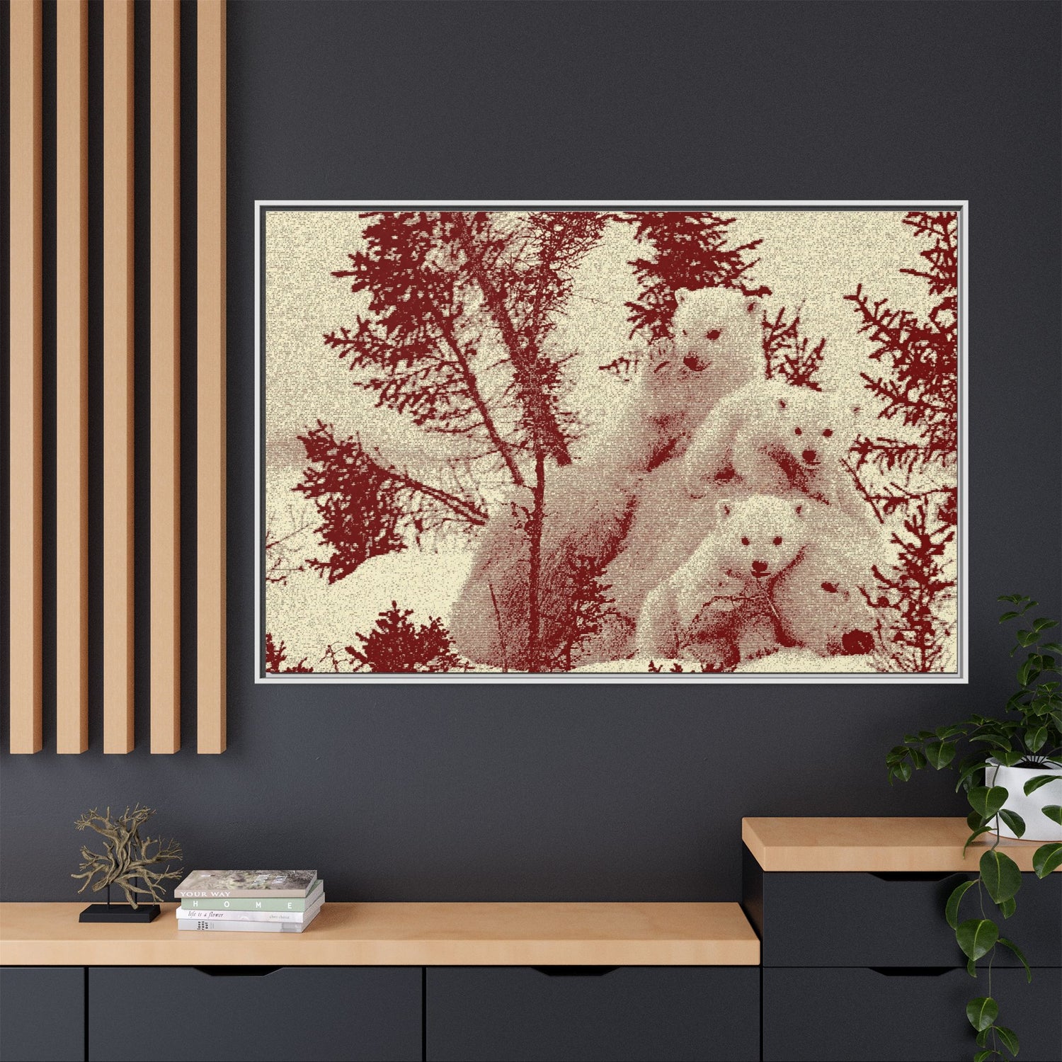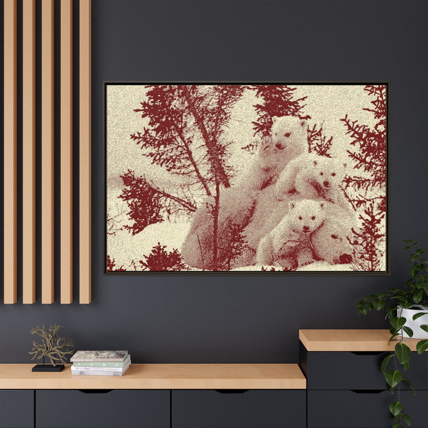 This fine art print captures a polar bear mother with her three playful cubs nestled in the snowy wilderness of Wapusk National Park, Manitoba.