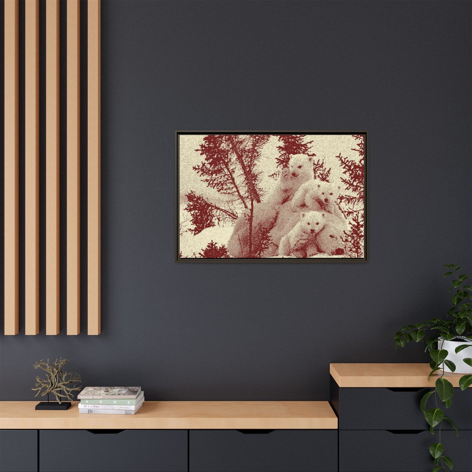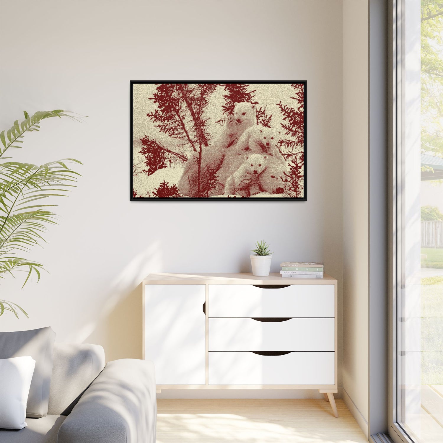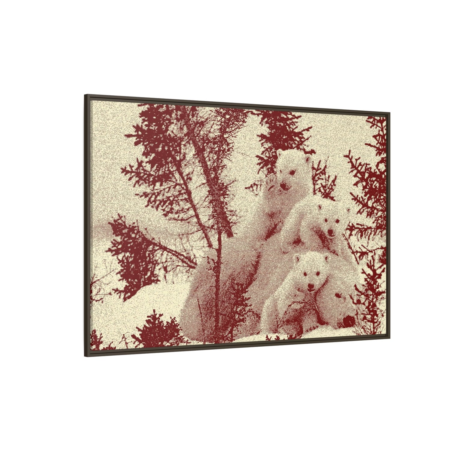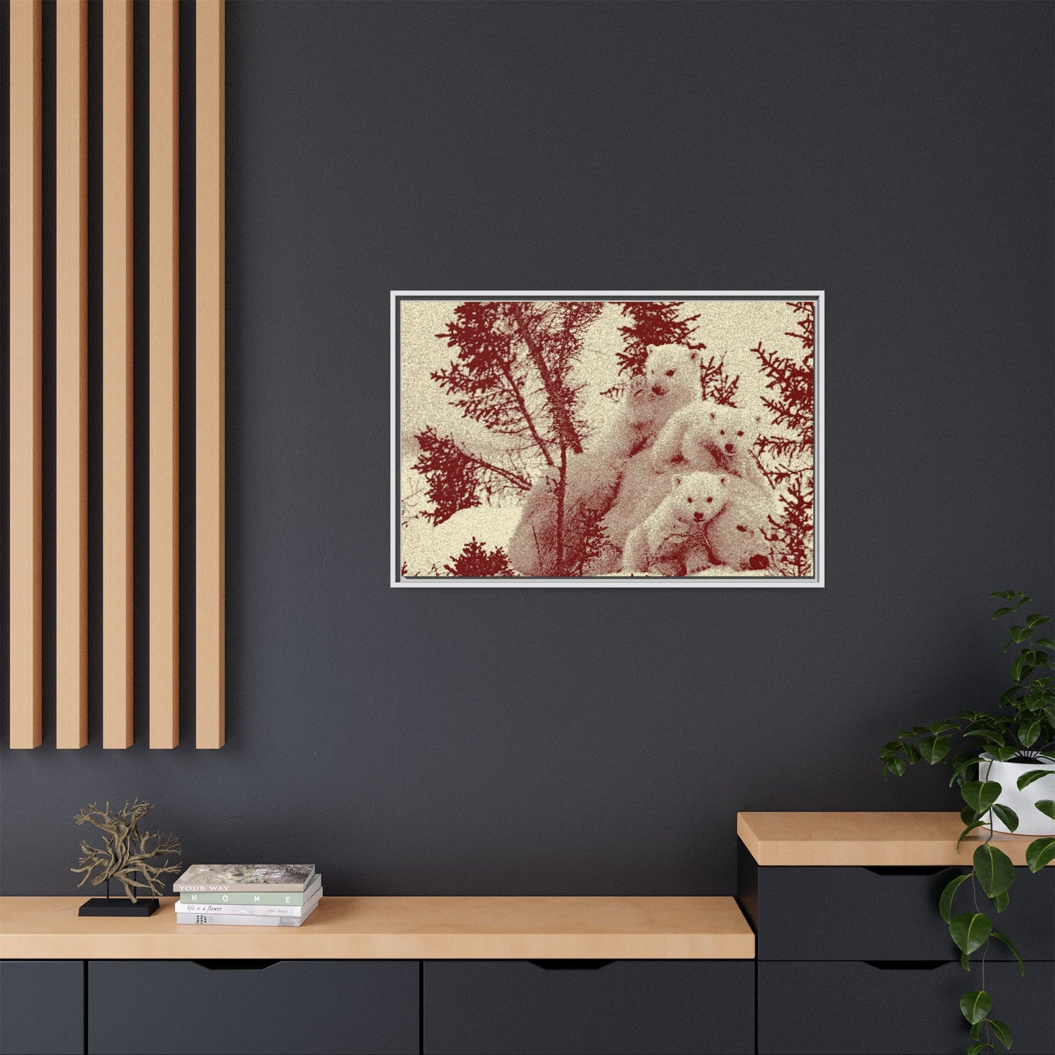 This fine art print captures a polar bear mother with her three playful cubs nestled in the snowy wilderness of Wapusk National Park, Manitoba.