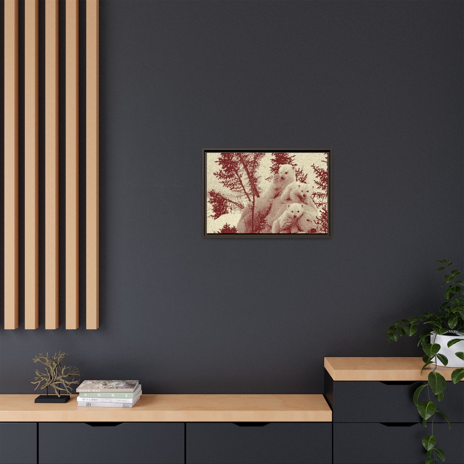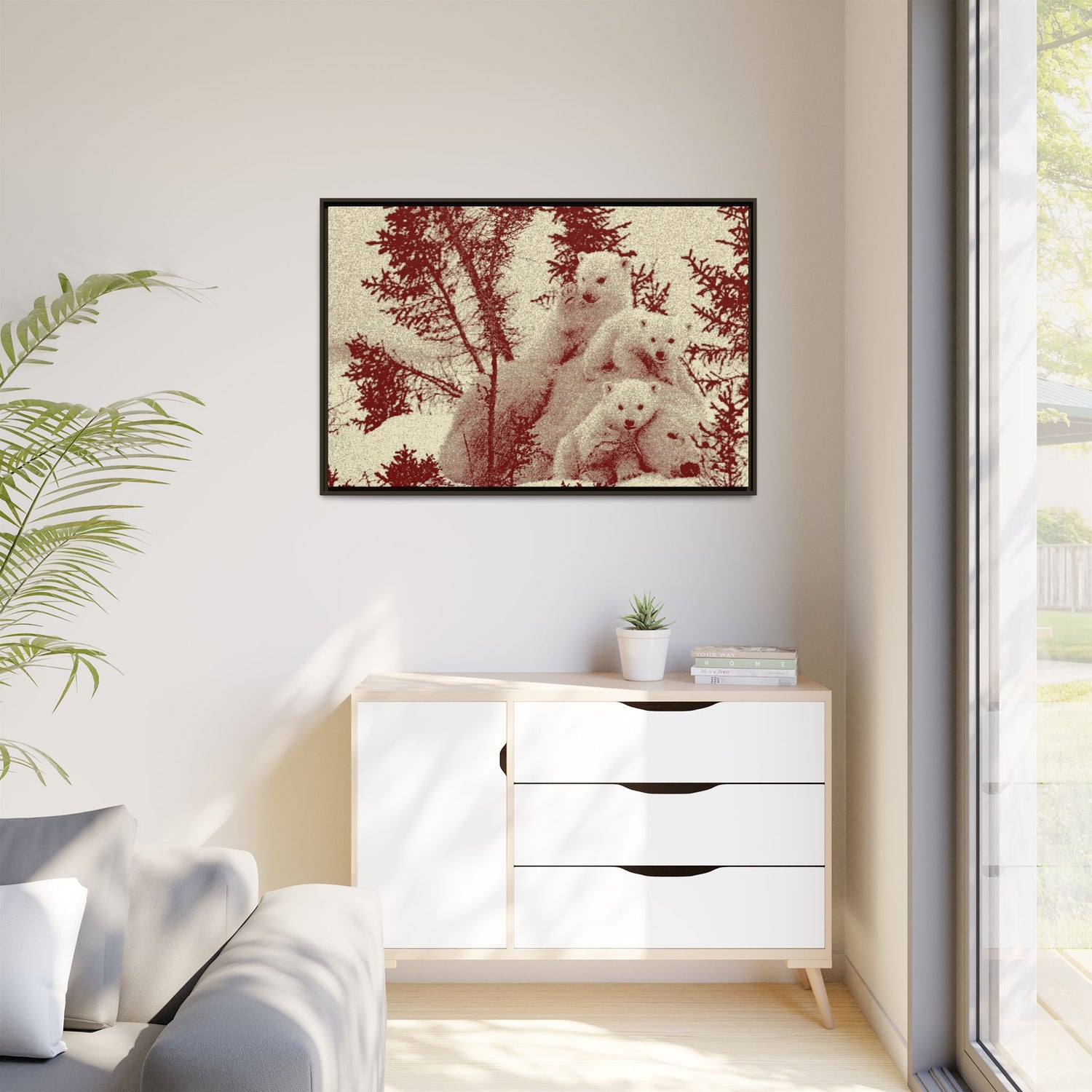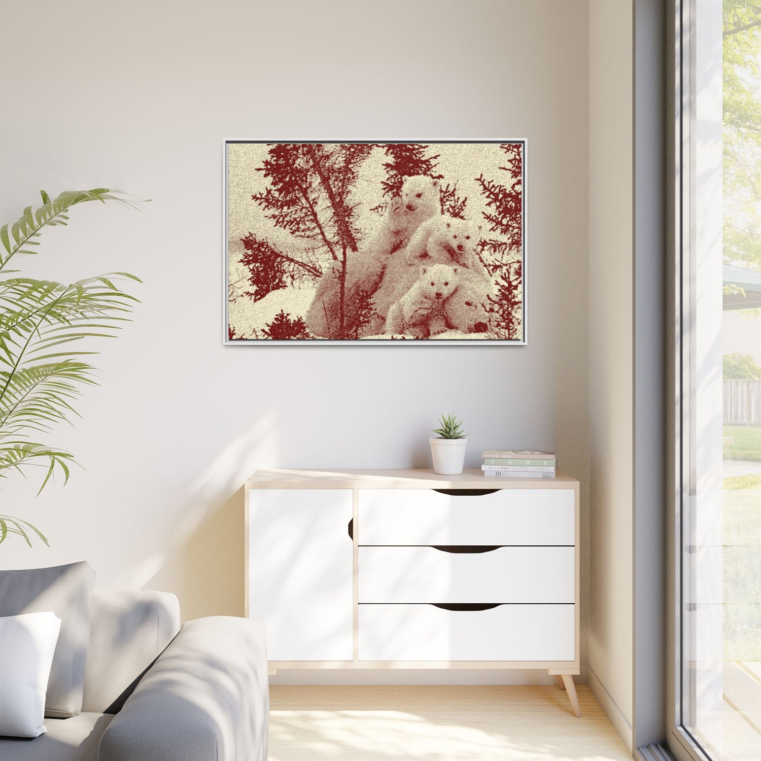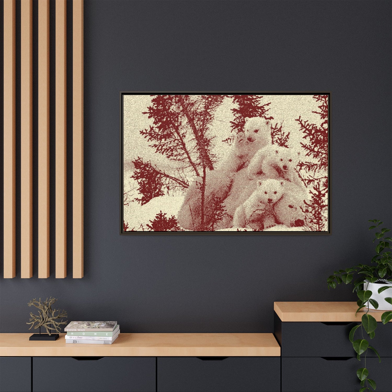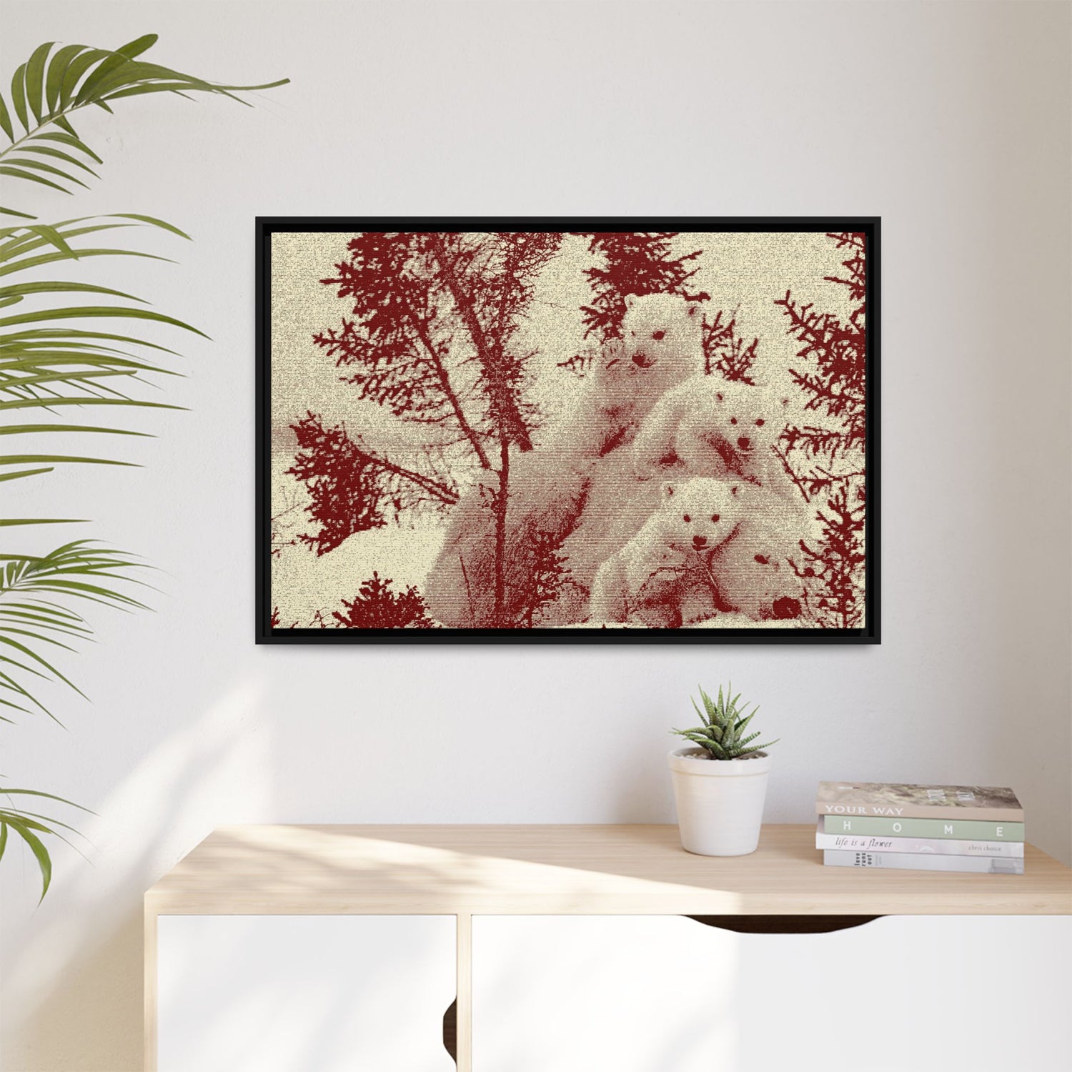 This fine art print captures a polar bear mother with her three playful cubs nestled in the snowy wilderness of Wapusk National Park, Manitoba.
