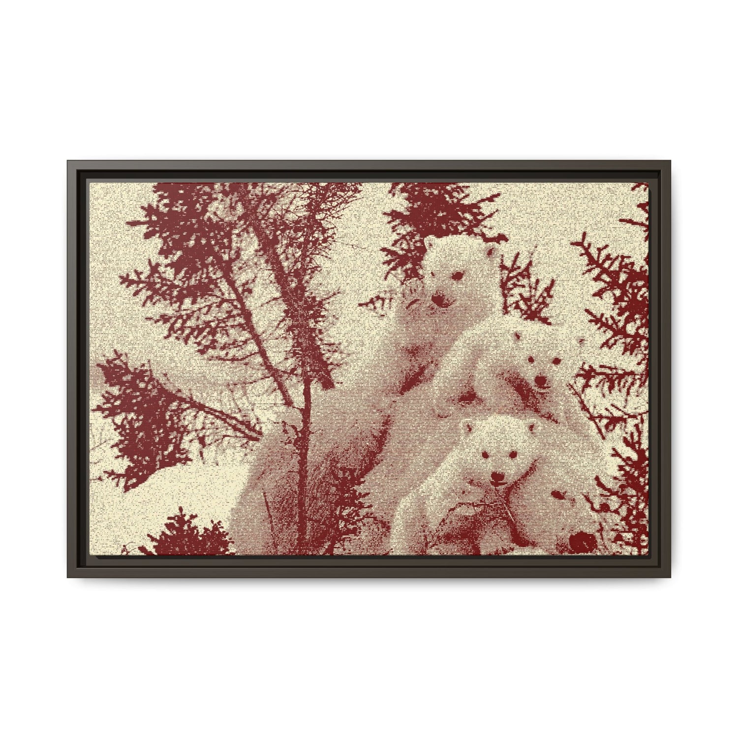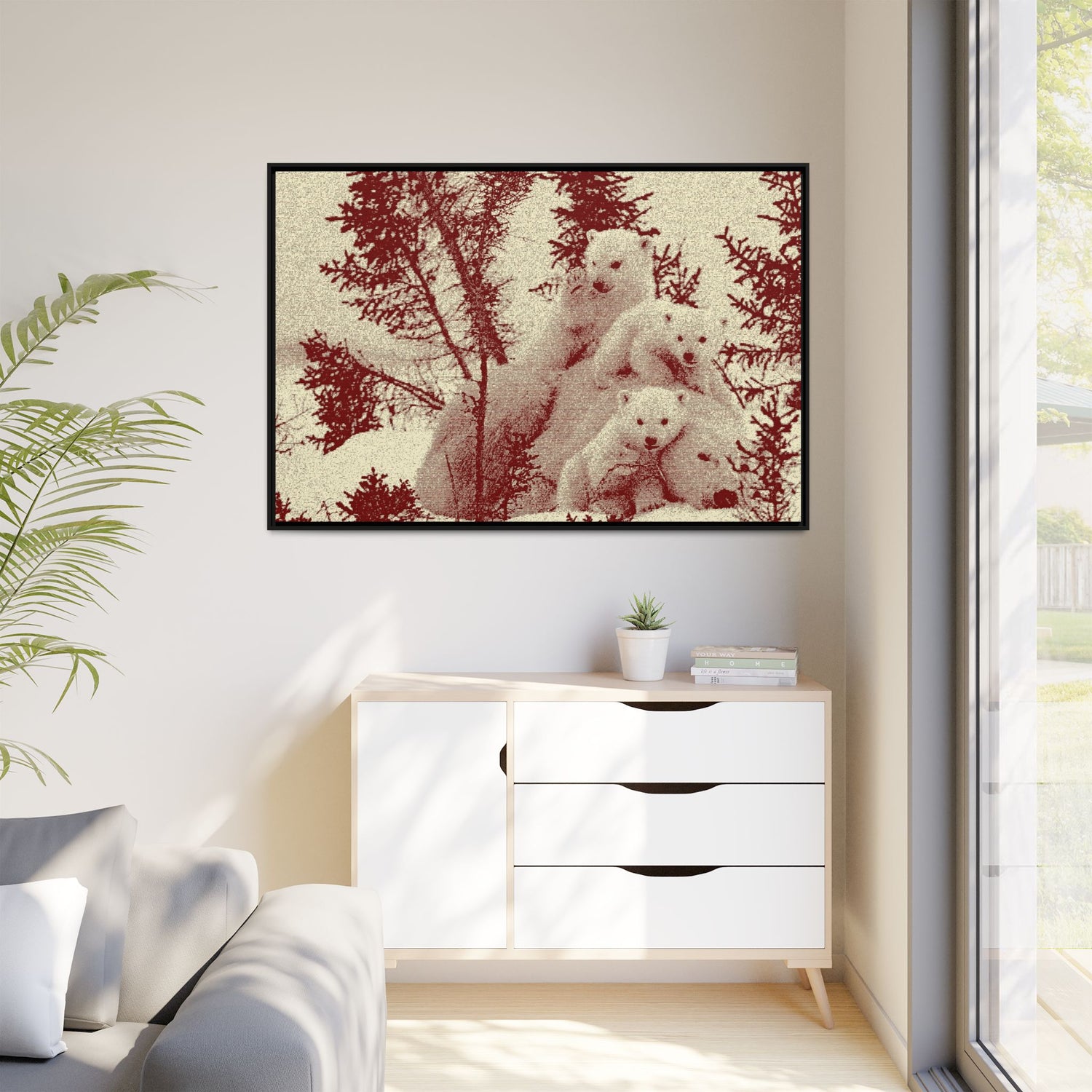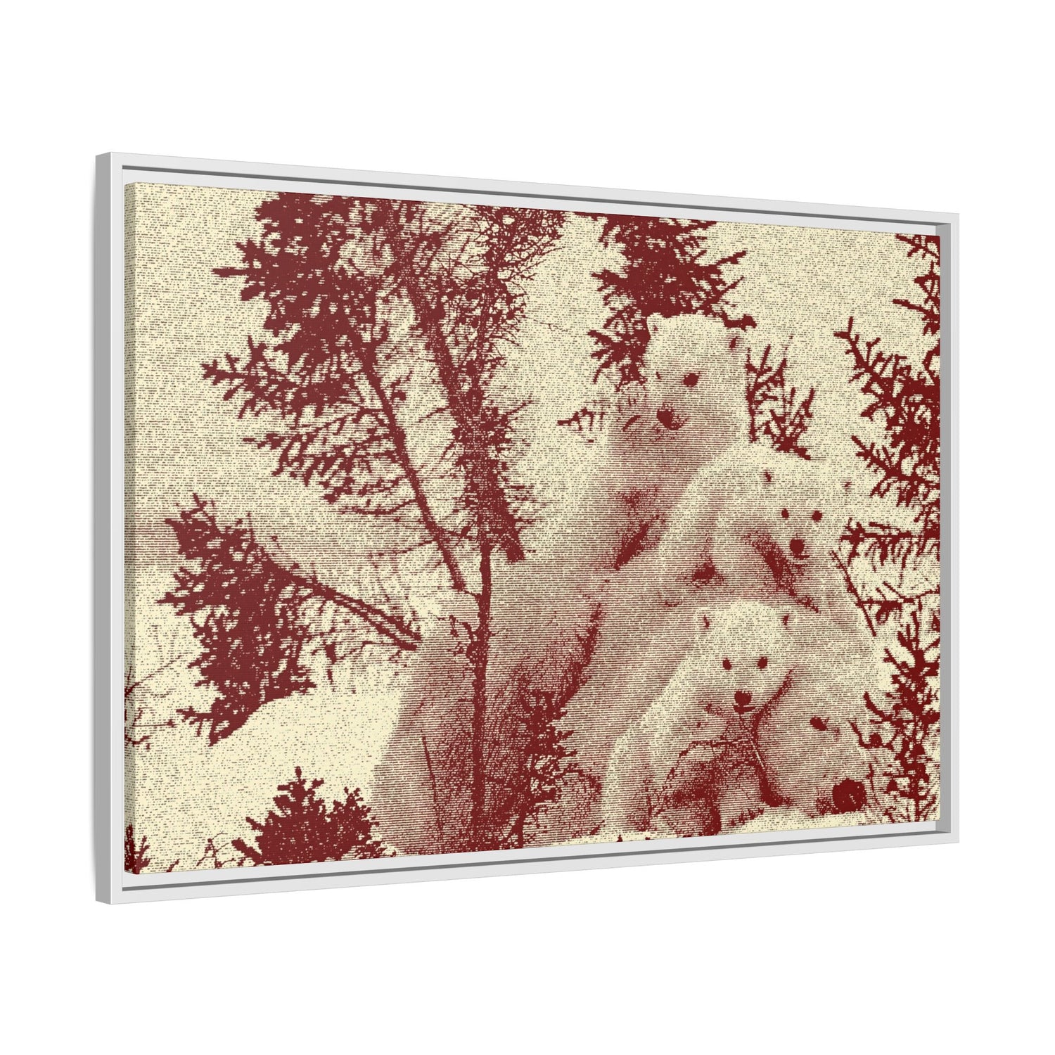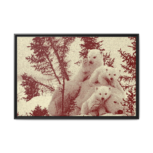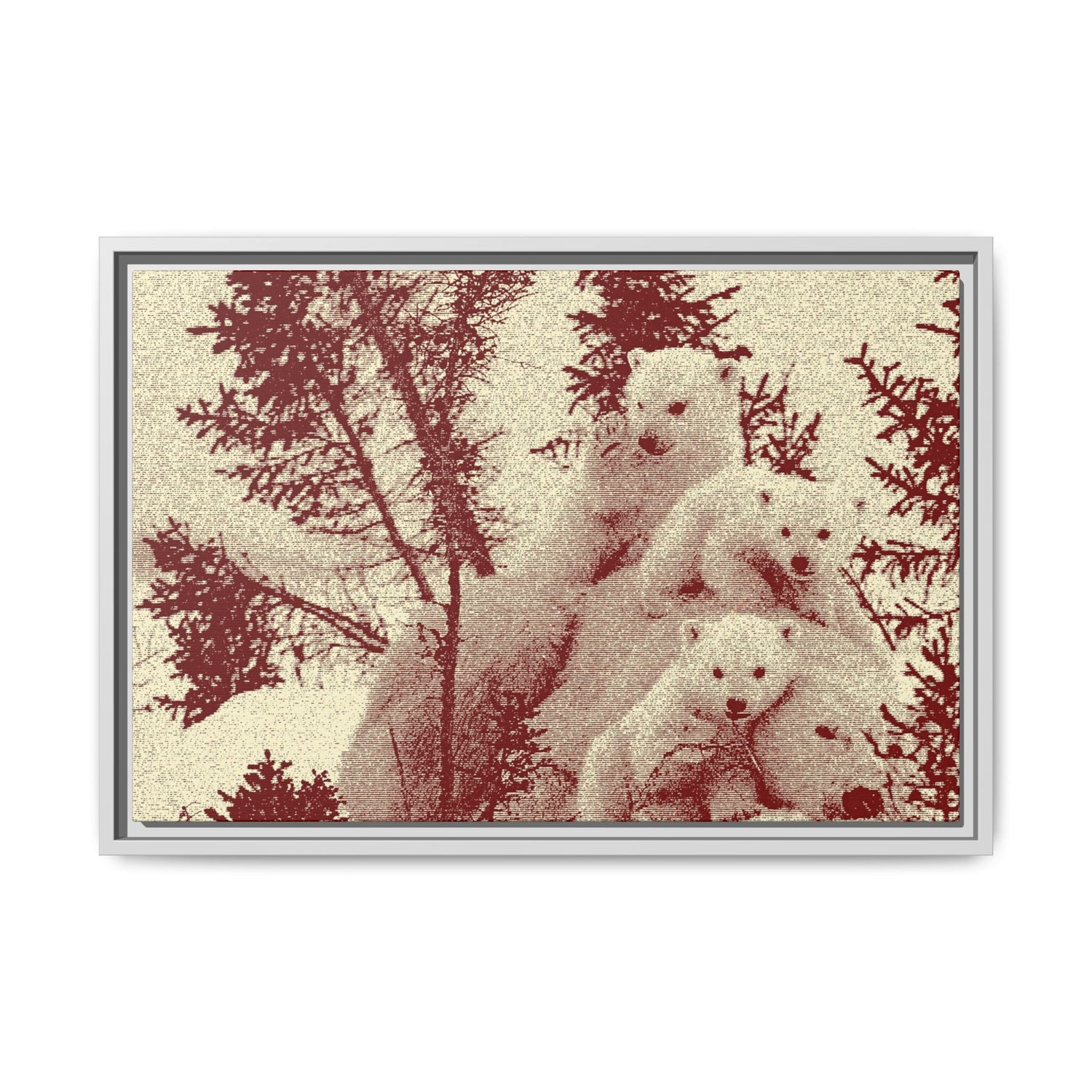 This fine art print captures a polar bear mother with her three playful cubs nestled in the snowy wilderness of Wapusk National Park, Manitoba.