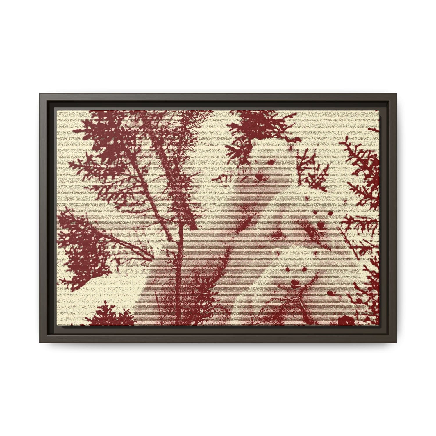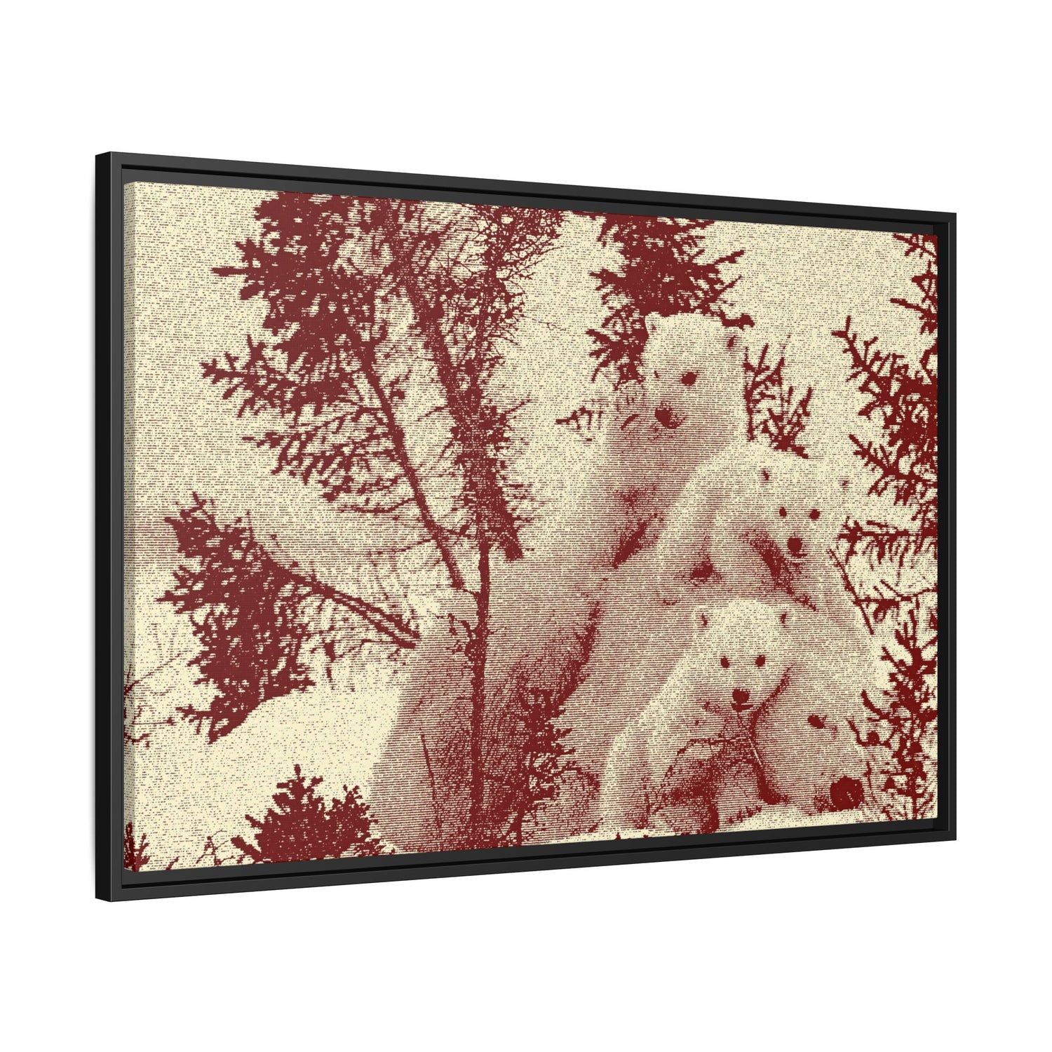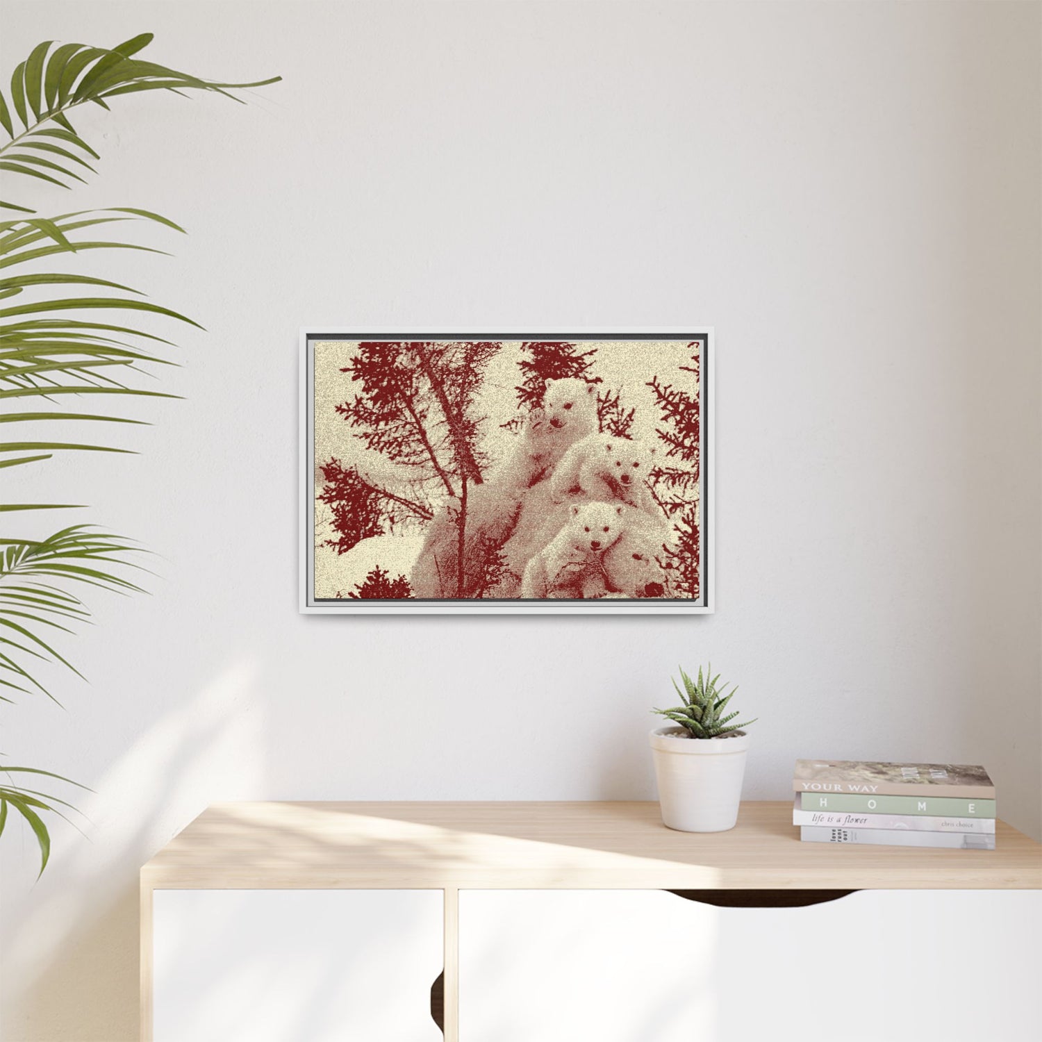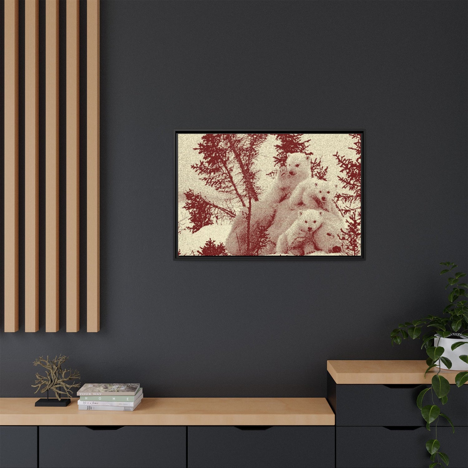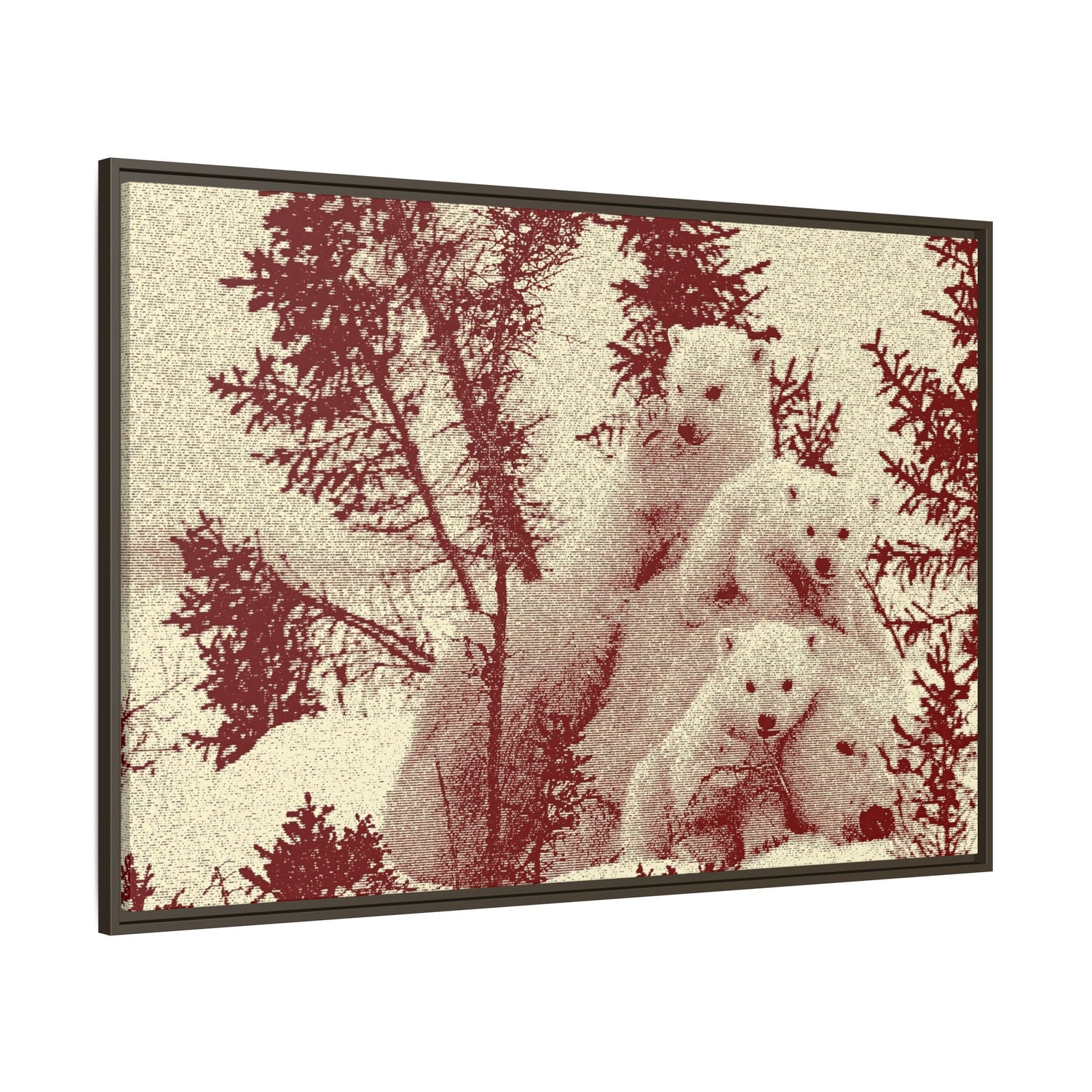 This fine art print captures a polar bear mother with her three playful cubs nestled in the snowy wilderness of Wapusk National Park, Manitoba.