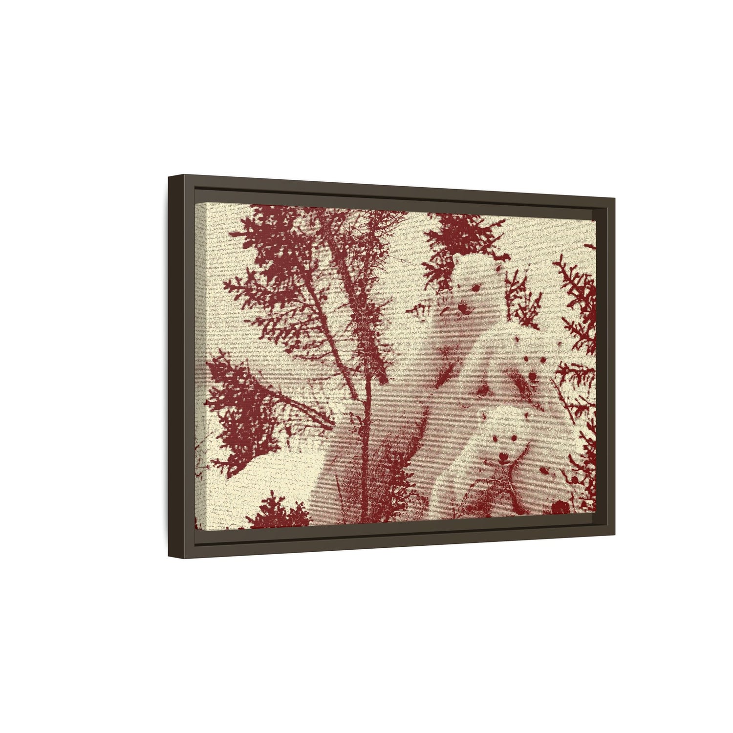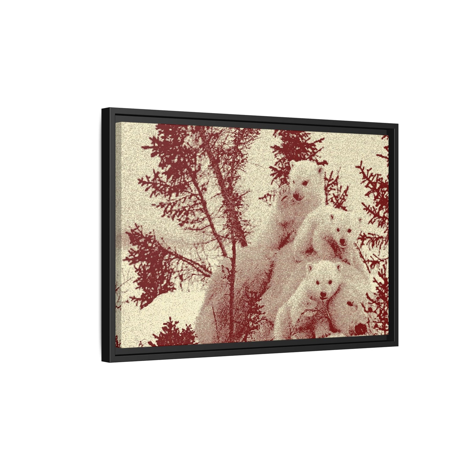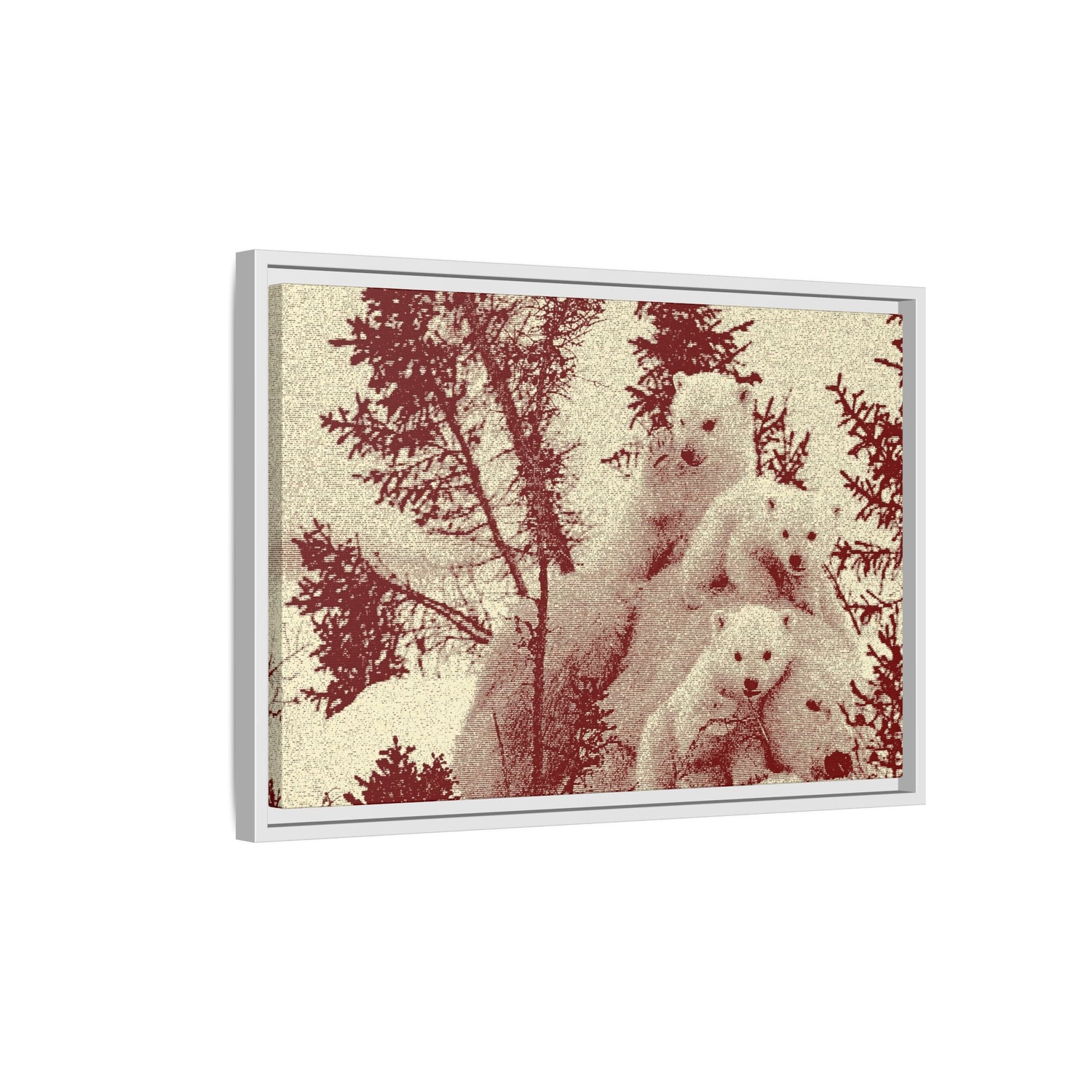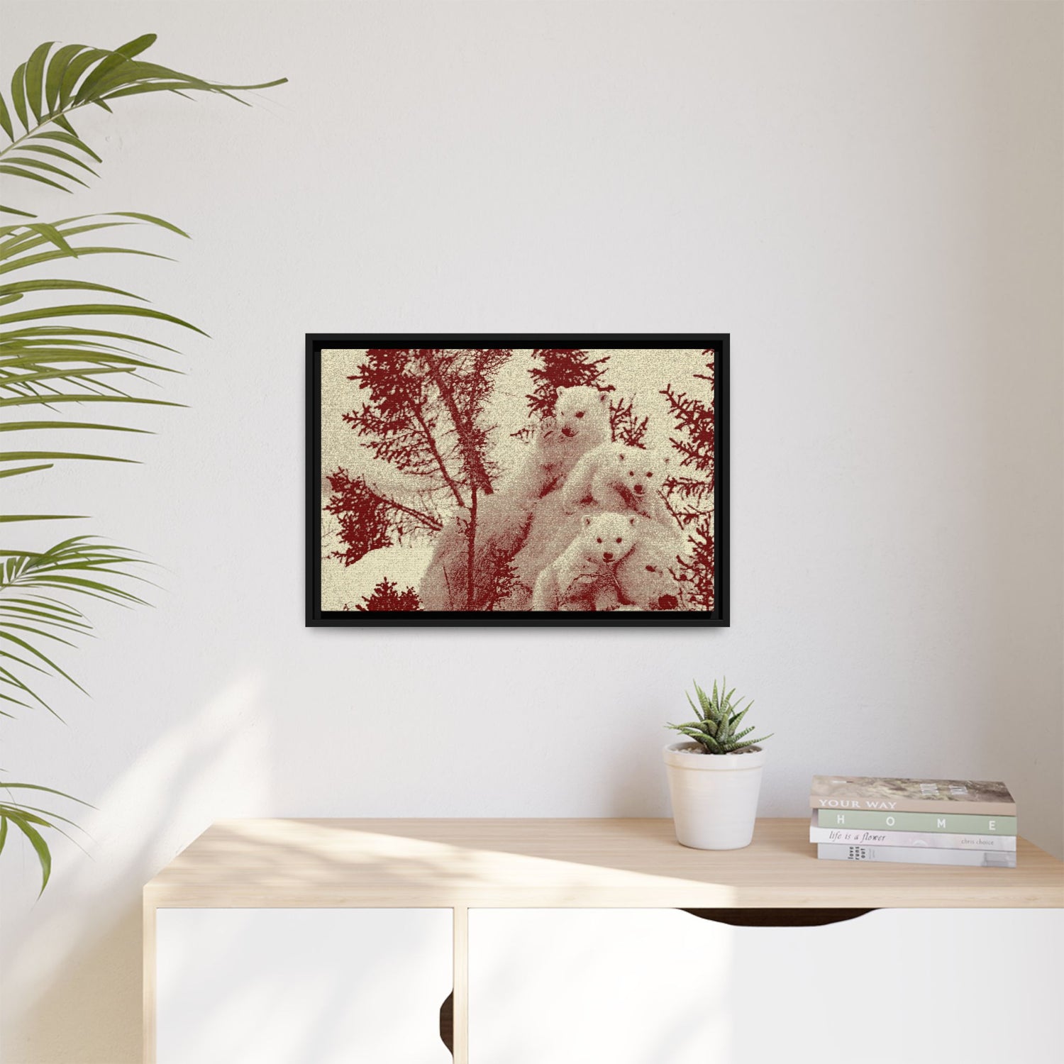 This fine art print captures a polar bear mother with her three playful cubs nestled in the snowy wilderness of Wapusk National Park, Manitoba.