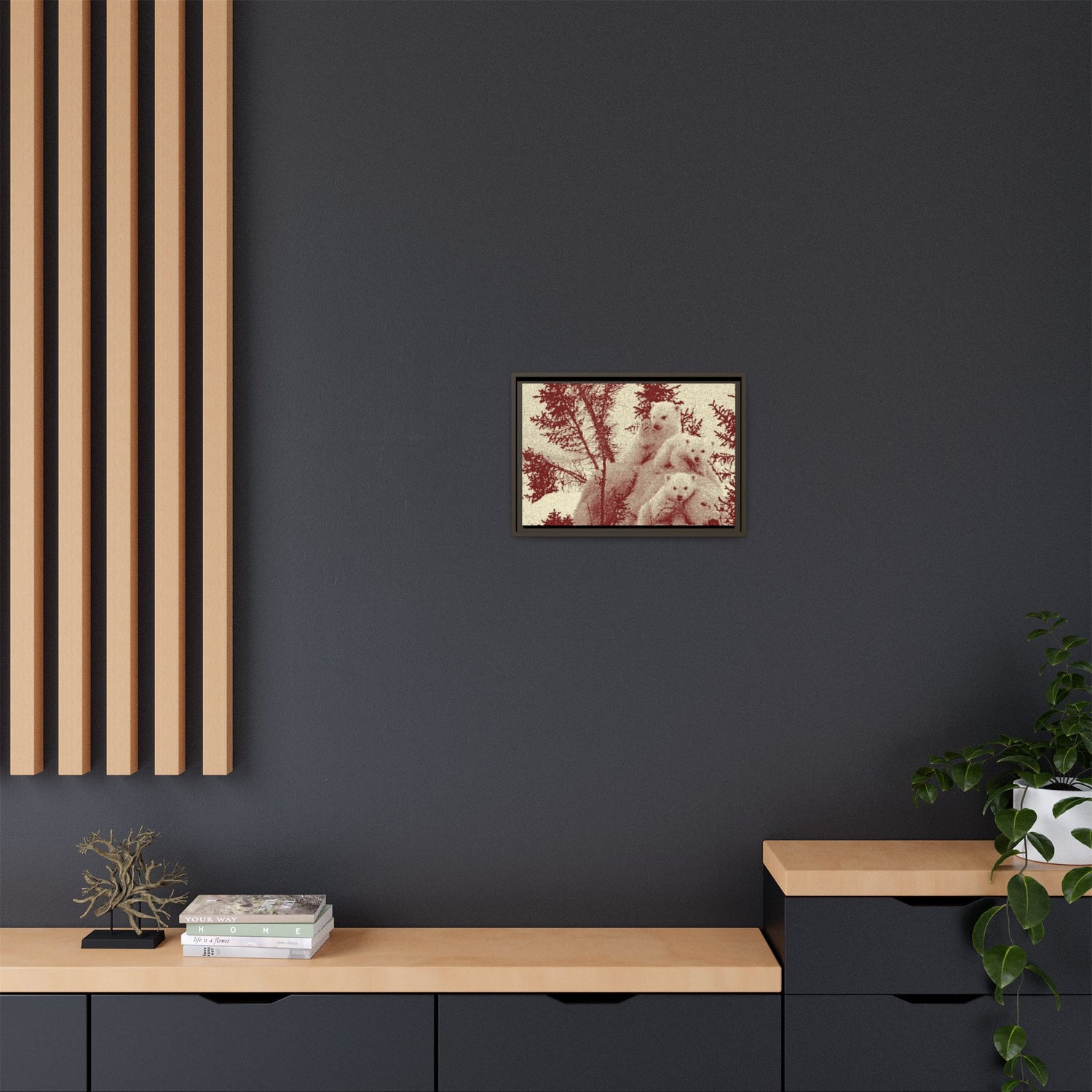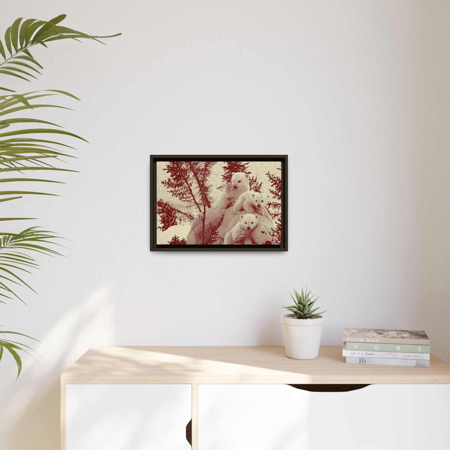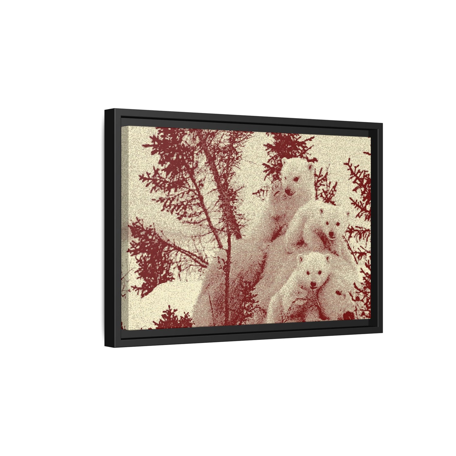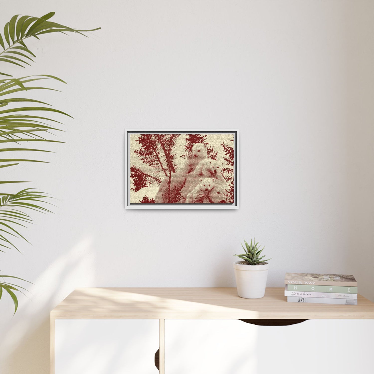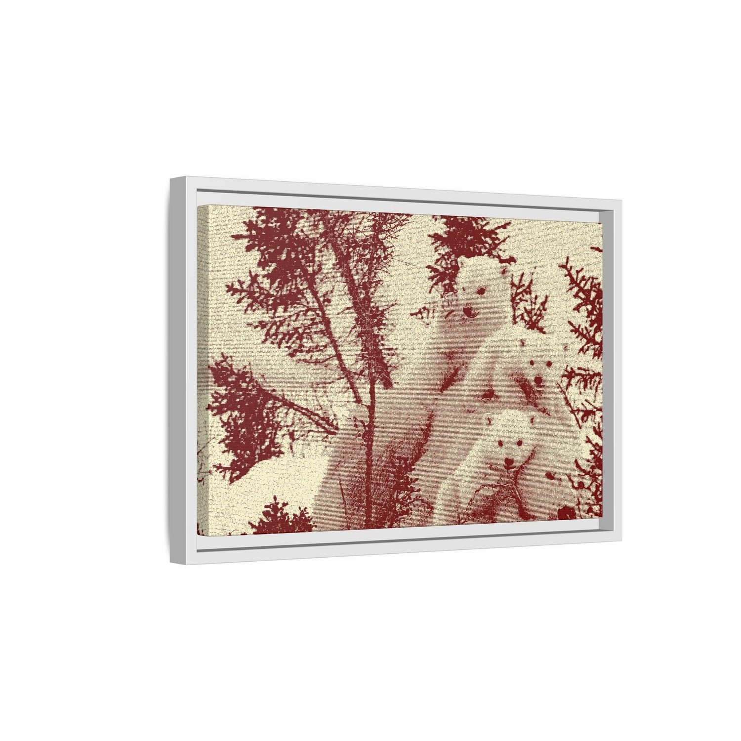 This fine art print captures a polar bear mother with her three playful cubs nestled in the snowy wilderness of Wapusk National Park, Manitoba.
