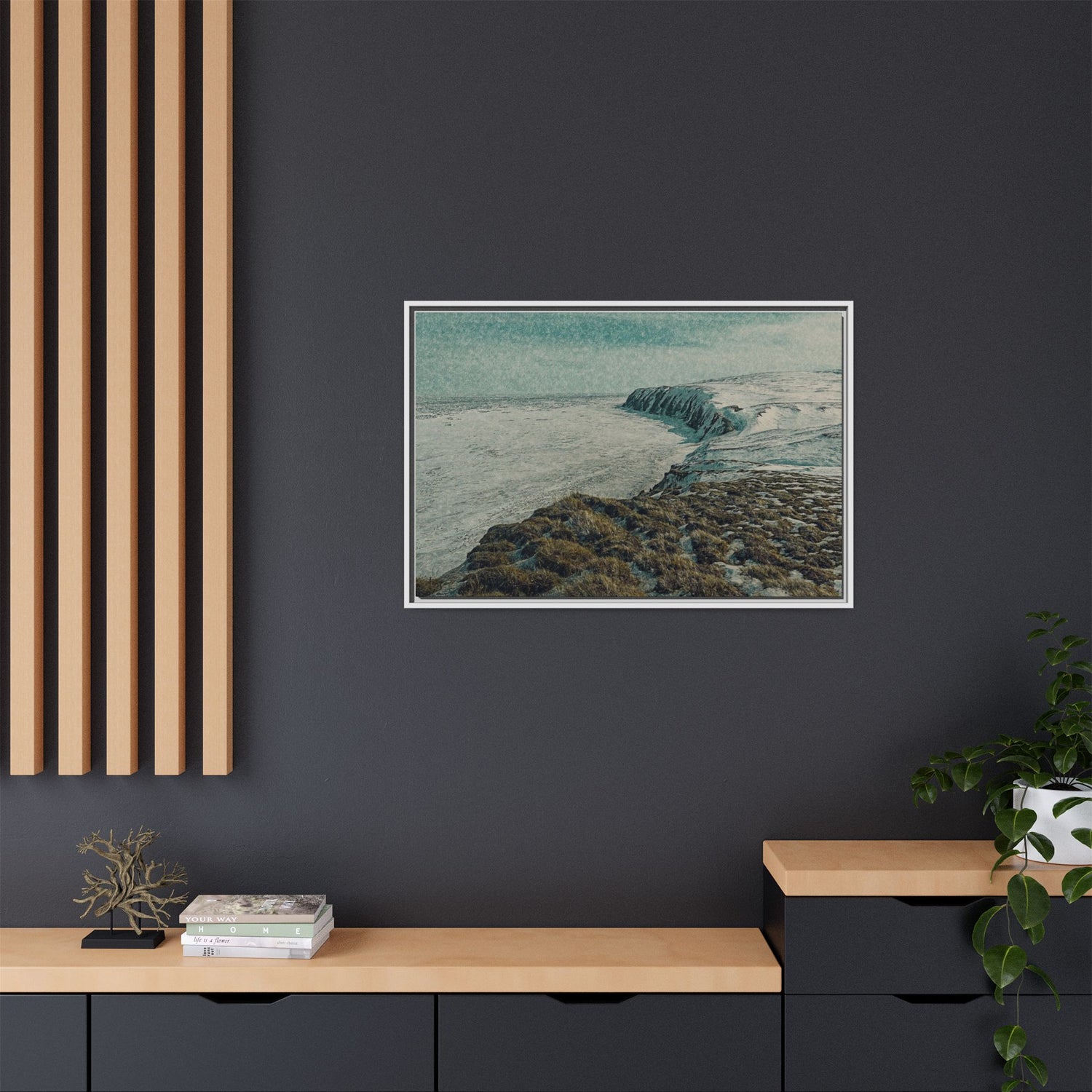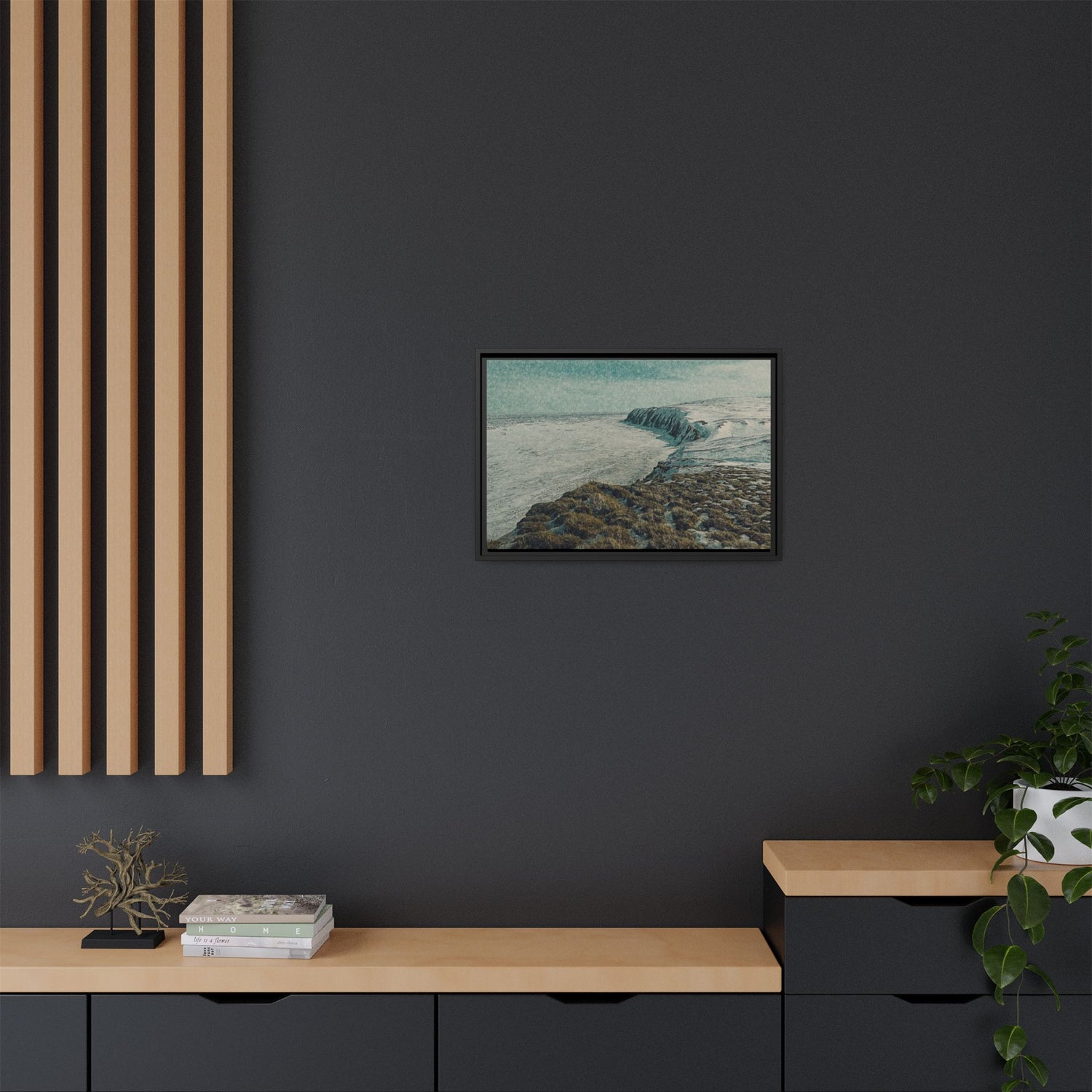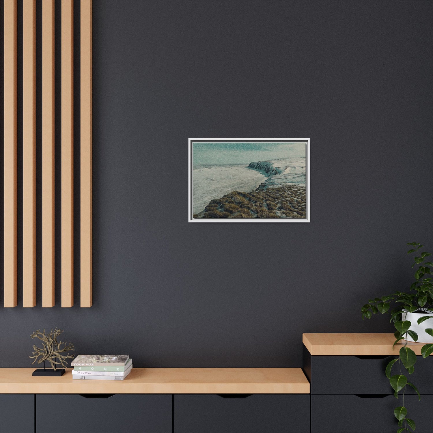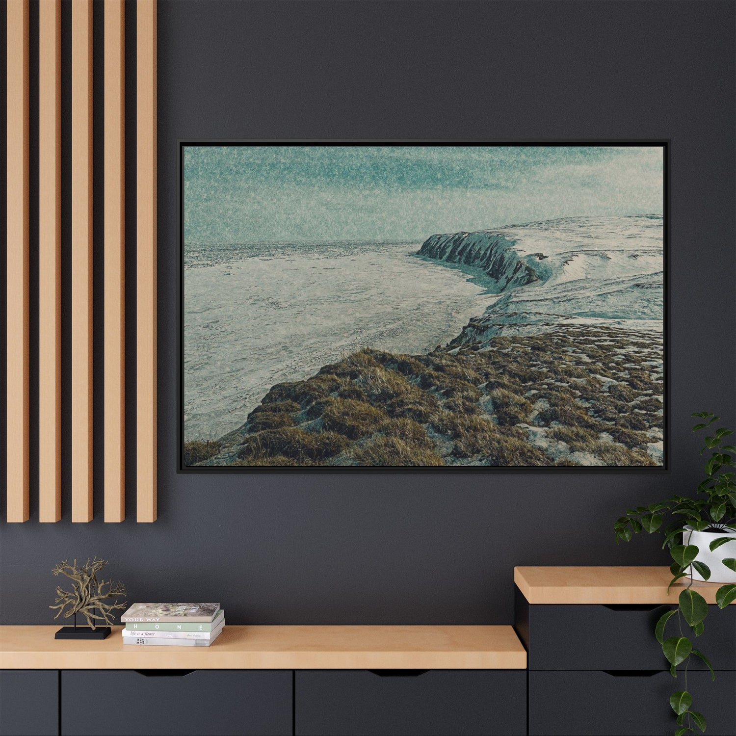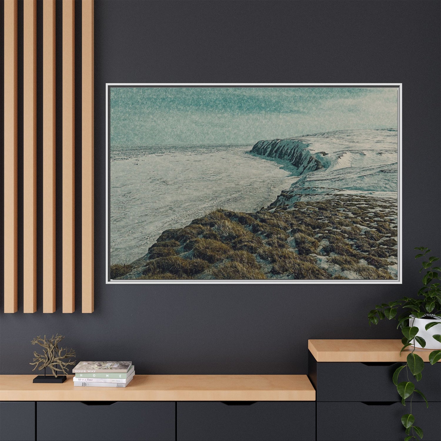 The rugged shoreline meets icy expanses beneath a muted sky, painted with textural layering and cool tones. The artwork evokes both calm and command, embodying the stark beauty of the Arctic coast. Ideal as a centerpiece, it brings a sense of remote wilderness into modern interiors.