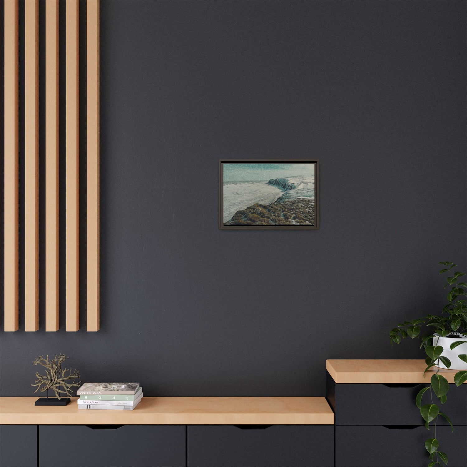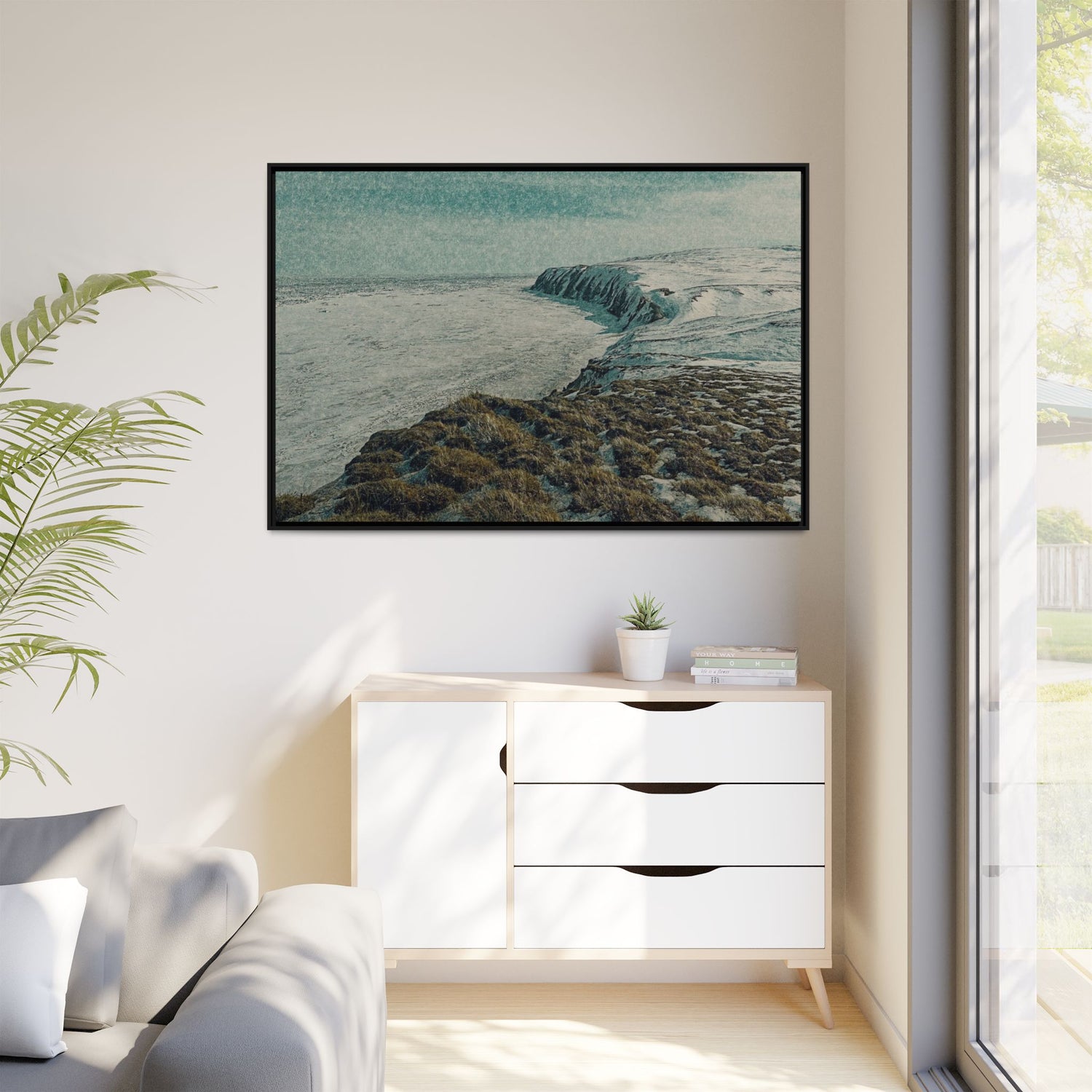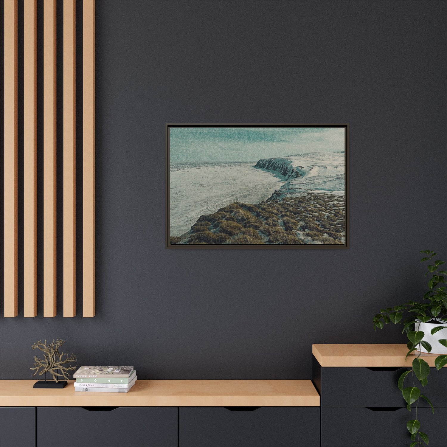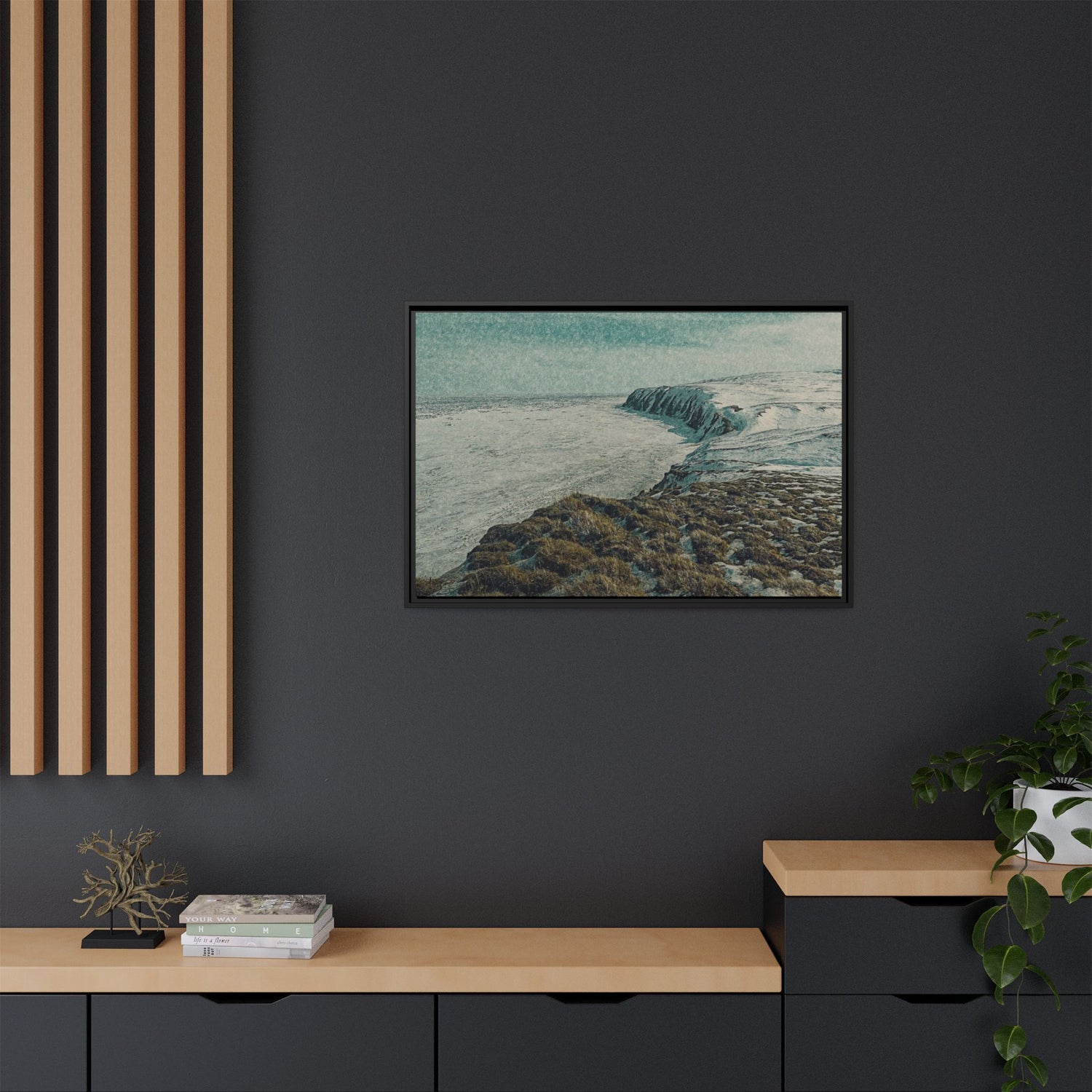 The rugged shoreline meets icy expanses beneath a muted sky, painted with textural layering and cool tones. The artwork evokes both calm and command, embodying the stark beauty of the Arctic coast. Ideal as a centerpiece, it brings a sense of remote wilderness into modern interiors.
