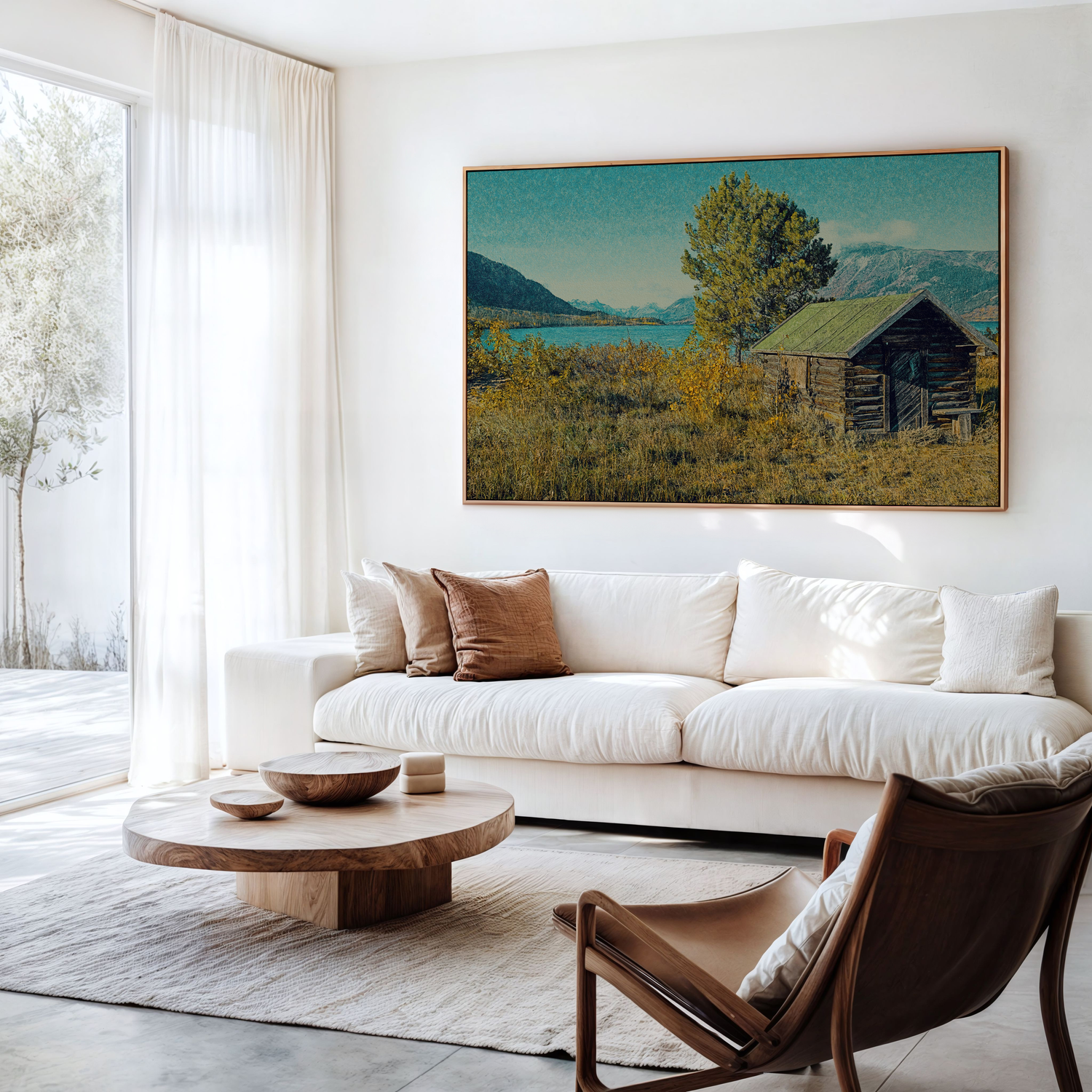 This fine art print portrays a rustic log cabin on the shore of Lake Bennett near Carcross, Yukon Territory, framed by golden foliage, still waters, and distant mountain peaks. The plein air–inspired brushwork and crisp daylight tones evoke the quiet solitude of the northern wilderness. A scene of enduring calm and simplicity, perfect for bringing natural serenity into contemporary interiors.